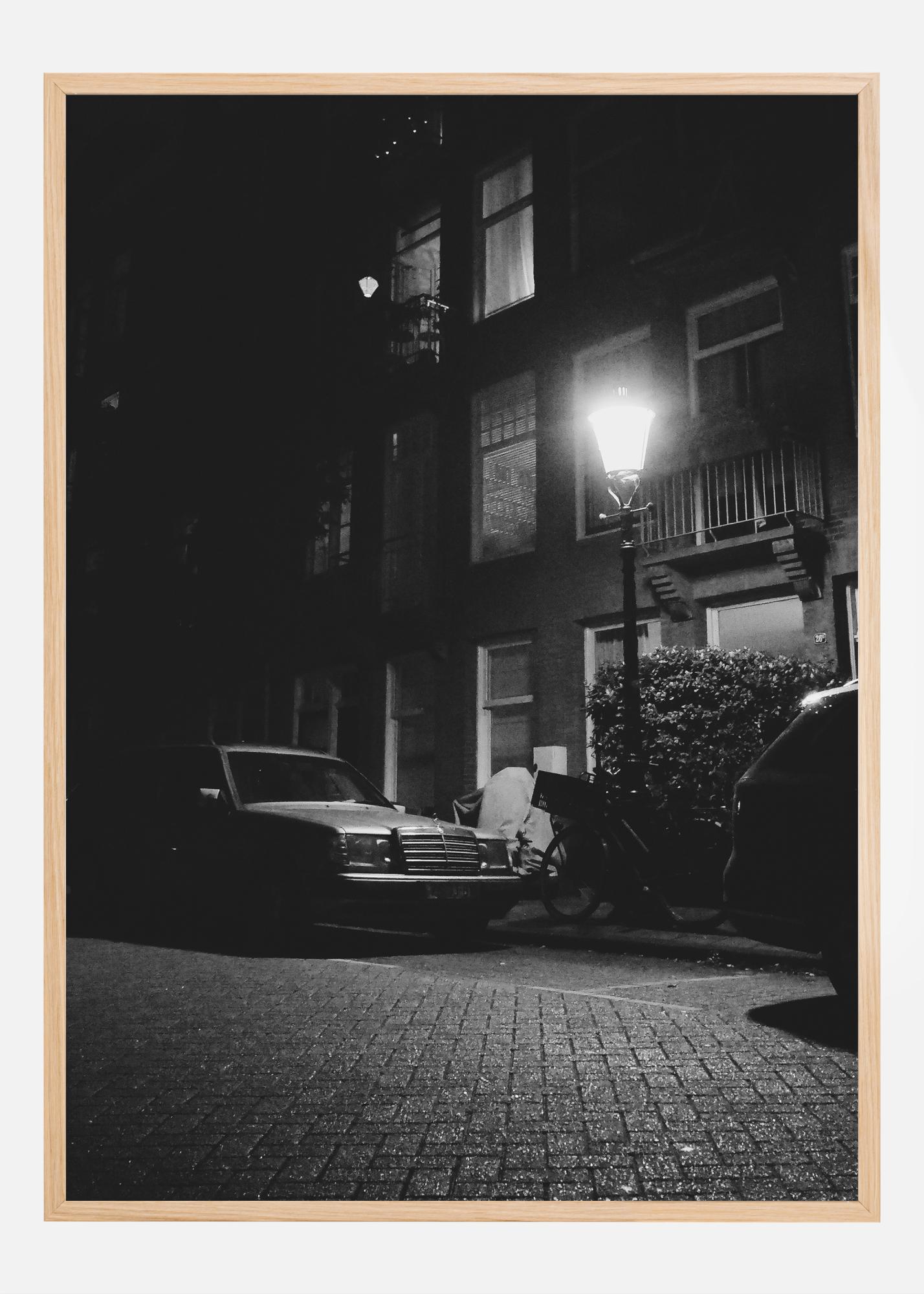 Cette affiche captivante offre un aperçu de la vie urbaine lorsque la nuit tombe. Un réverbère solitaire baigne le trottoir et les voitures garées dans une lumière douce et chaude. Les motifs sont capturés dans une palette monochrome qui renforce les contrastes et les détails de cette scène urbaine paisible. Cette impression est parfaite pour introduire un sentiment de tranquillité et de réflexion dans n'importe quelle pièce, rappelant les moments calmes dans le rythme autrement effréné de la ville.