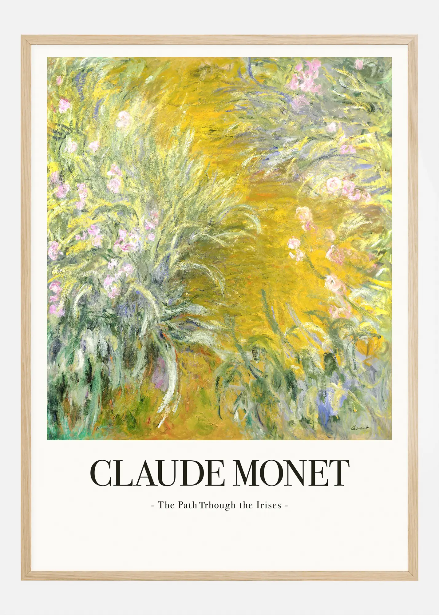Le titre du poster, 'Le Chemin à travers les Iris', nous présente la vision de Claude Monet de son jardin, un lieu qui lui a fourni une source d'inspiration inépuisable. Cette peinture, vibrante de tons jaunes et verts éclatants, complétée par les iris violets et roses caractéristiques, capte l'attention du spectateur et invite à une promenade le long du chemin invisible. La signature de Monet est discrètement placée dans le coin, renforçant l'authenticité de l'œuvre d'art et son importance historique.