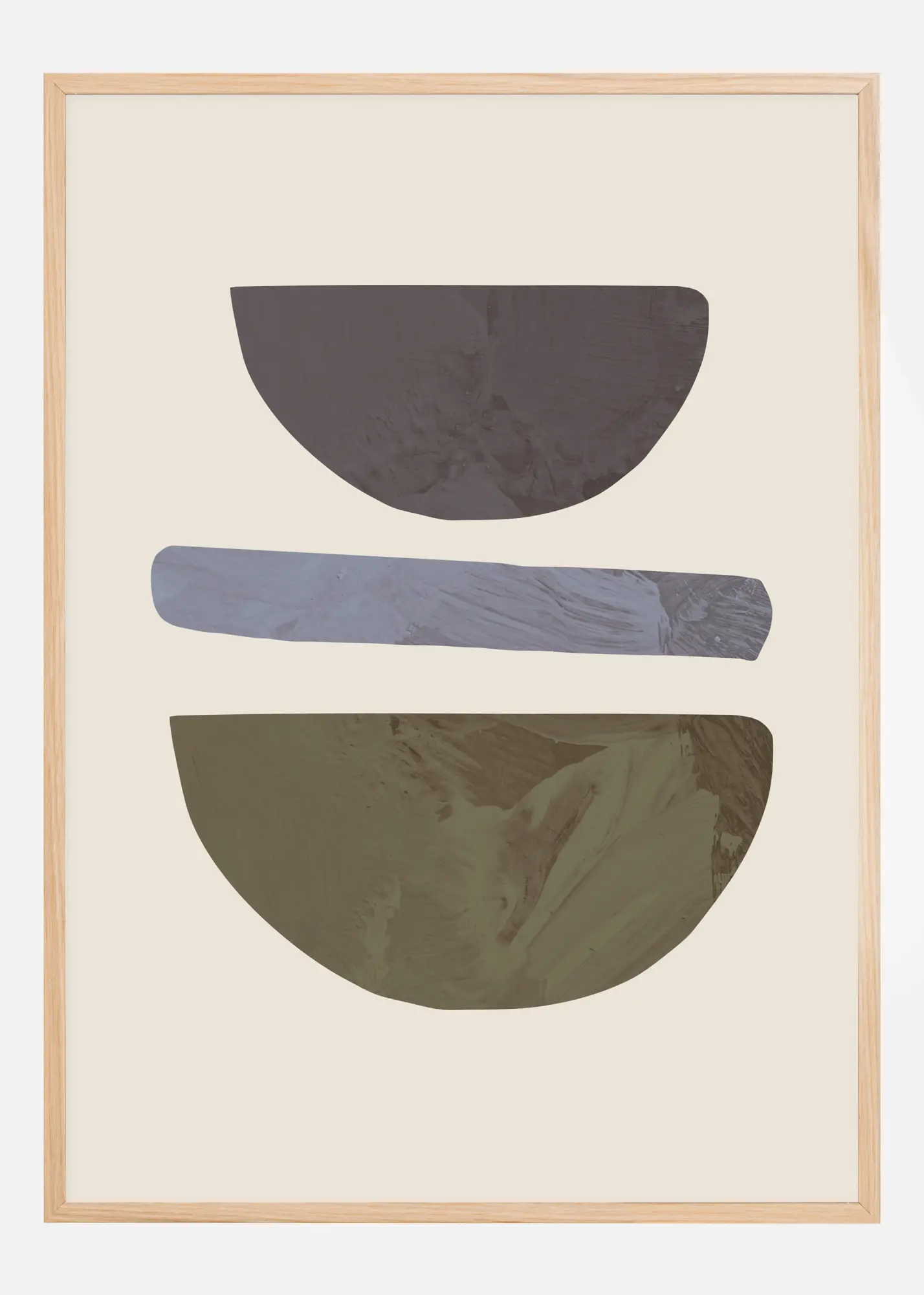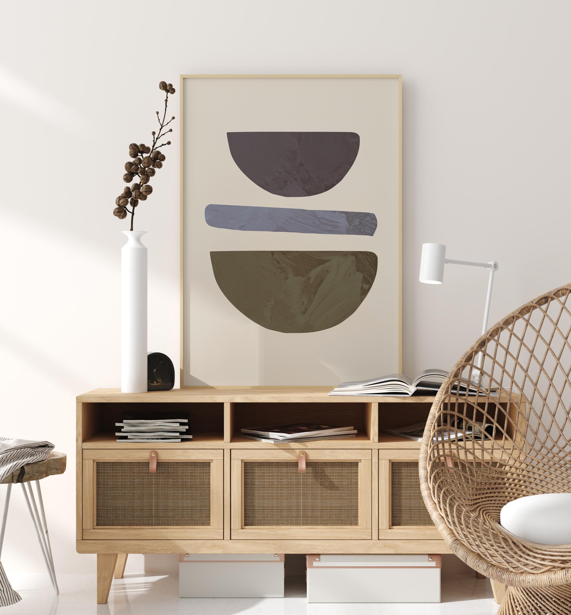 Une affiche de formes géométriques avec trois formes amusantes sur un fond blanc. Un demi-cercle jaune se trouve en bas, un cercle bleu au-dessus et une dernière forme grise, abstraite, en haut. Trouver des motifs dans cette affiche étrange, mais unique.