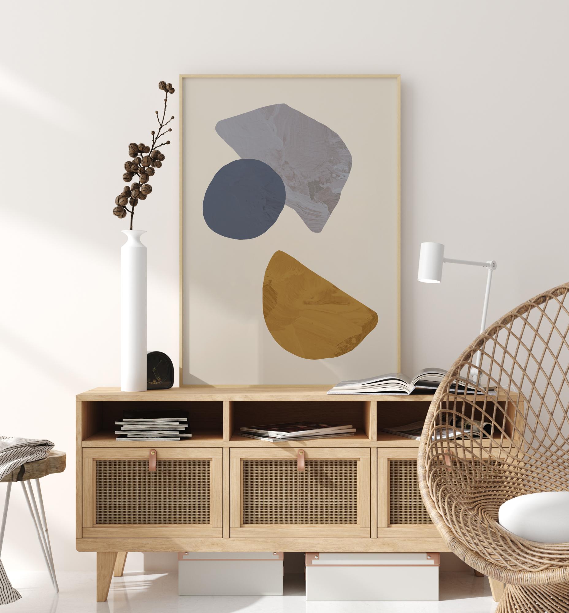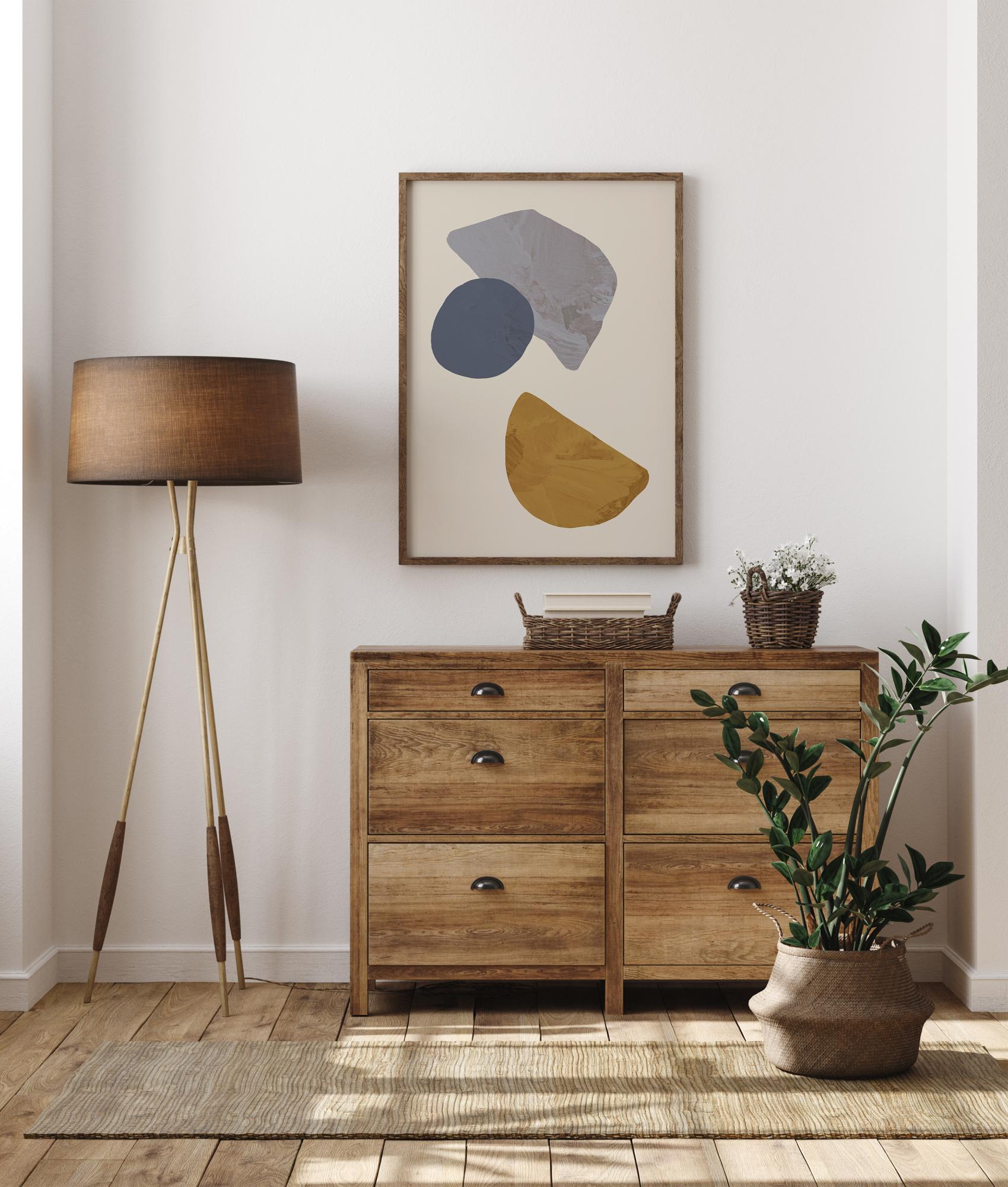 Une affiche de formes géométriques avec trois formes amusantes sur un fond blanc. Un demi-cercle jaune se trouve en bas, un cercle bleu au-dessus et une dernière forme grise, abstraite, en haut. Trouver des motifs dans cette affiche étrange, mais unique.