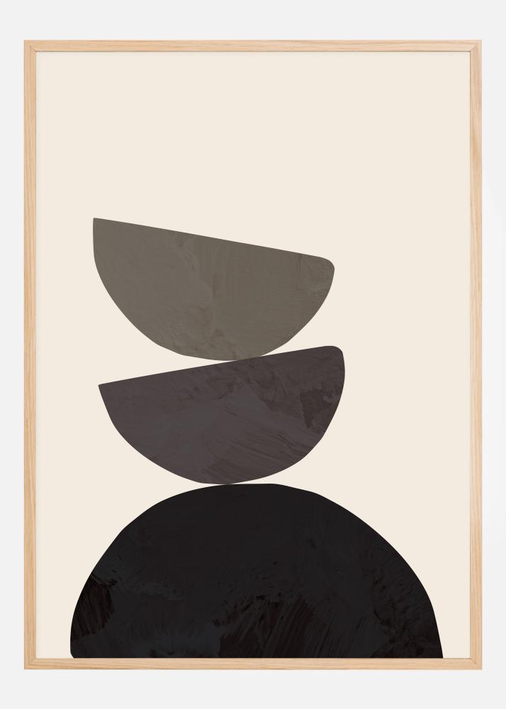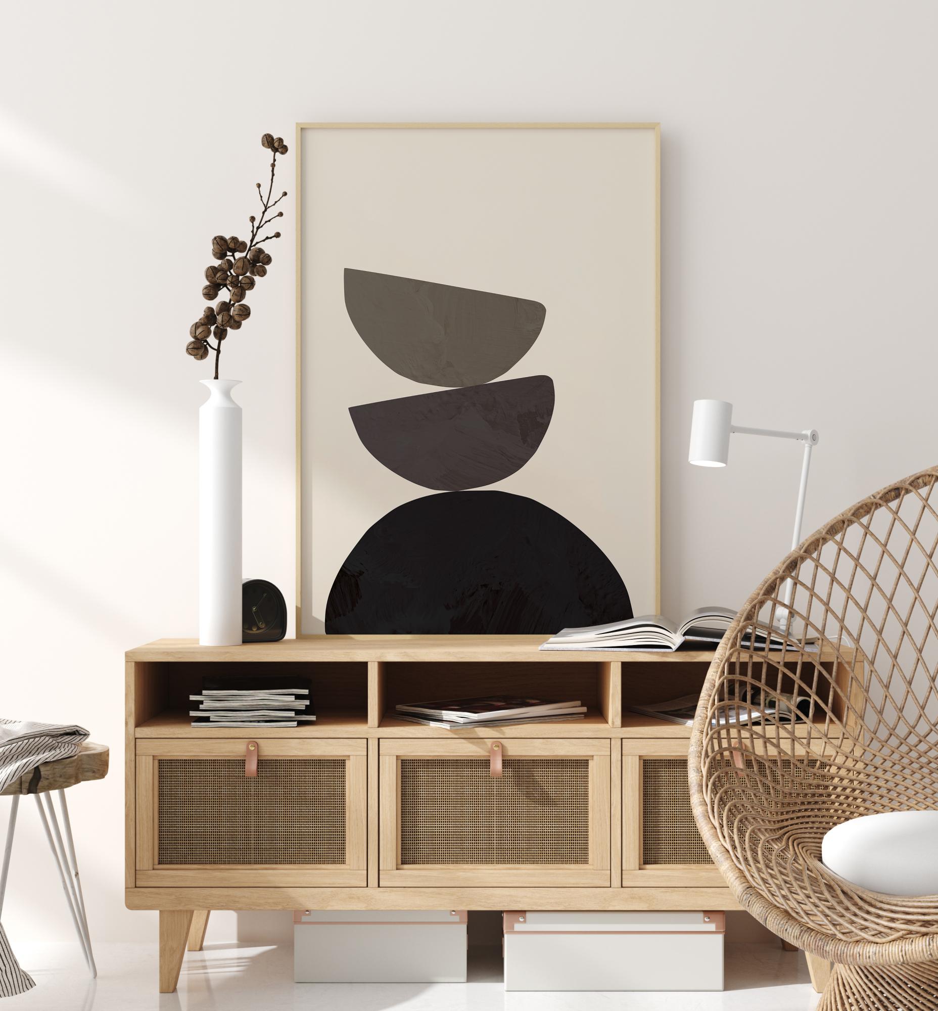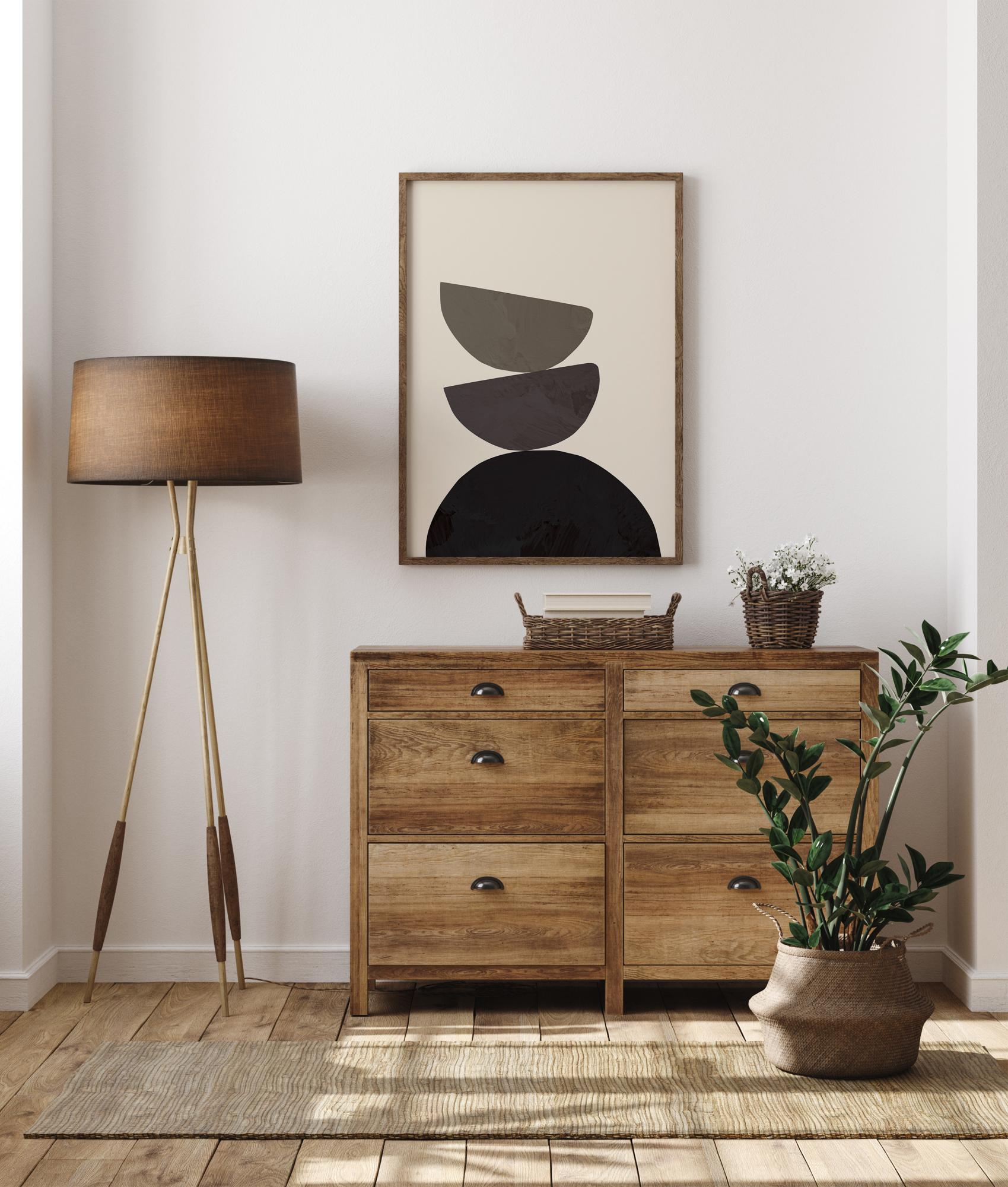 Une affiche abstraite remplie de différents demi-cercles et formes circulaires. Il y a deux colonnes de formes, chacune avec des motifs de cercles et de demi-cercles, tous dans des nuances de bleu, gris et rouge. Égayez un mur monochrome avec ces formes géométriques et amusez-vous, chez vous.