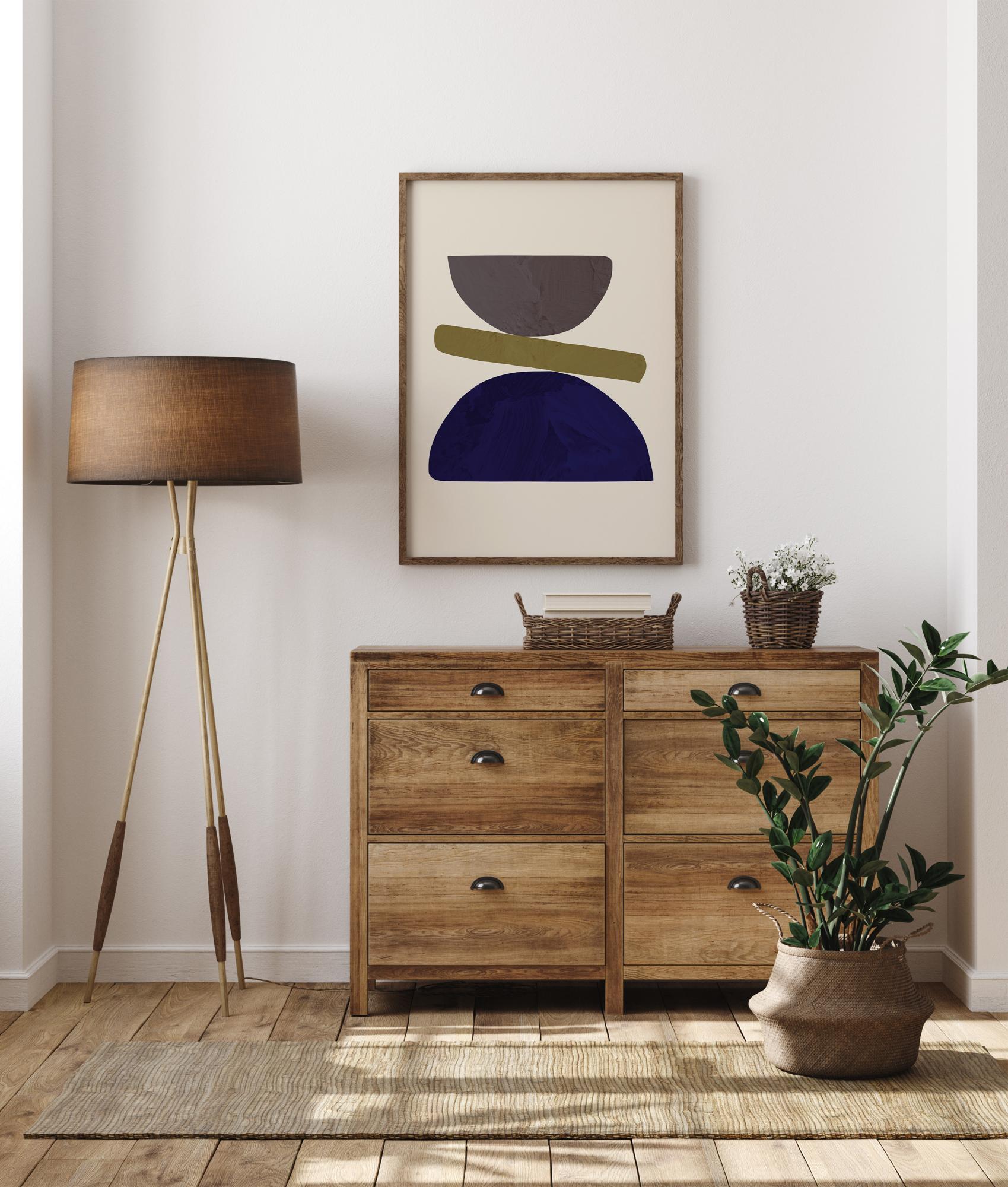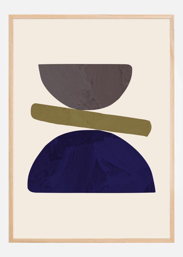 Une affiche lumineuse avec trois formes bleu foncé et noires créant une image fascinante. Un demi-cercle se trouve en bas, en équilibre avec un autre demi-cercle tourné vers le haut. Un cercle noir flotte au-dessus, le tout sur un fond blanc saisissant. Assortissez les magnifiques tourbillons de marbre avec un mur au ton plus pâle. Effet garanti !