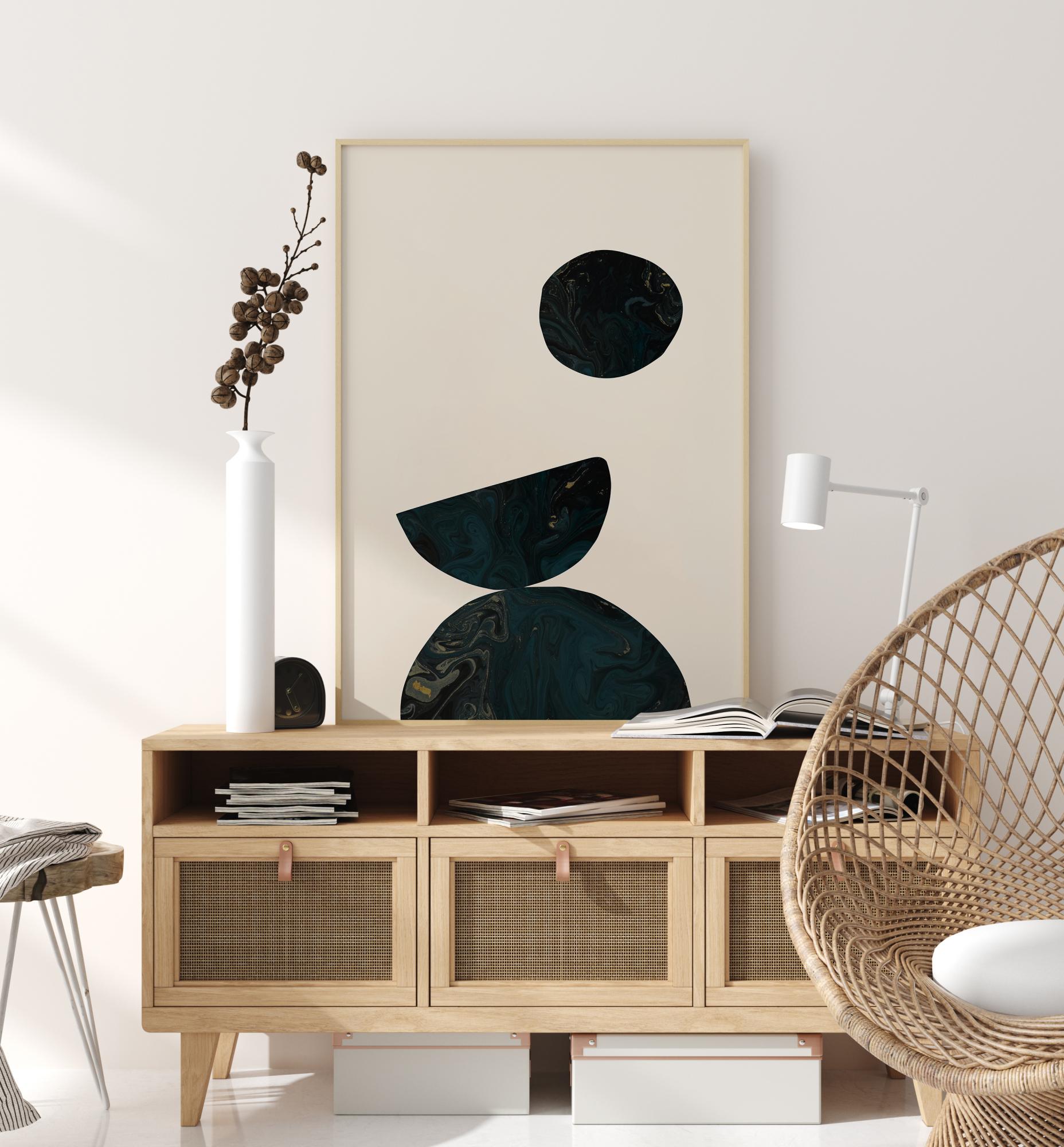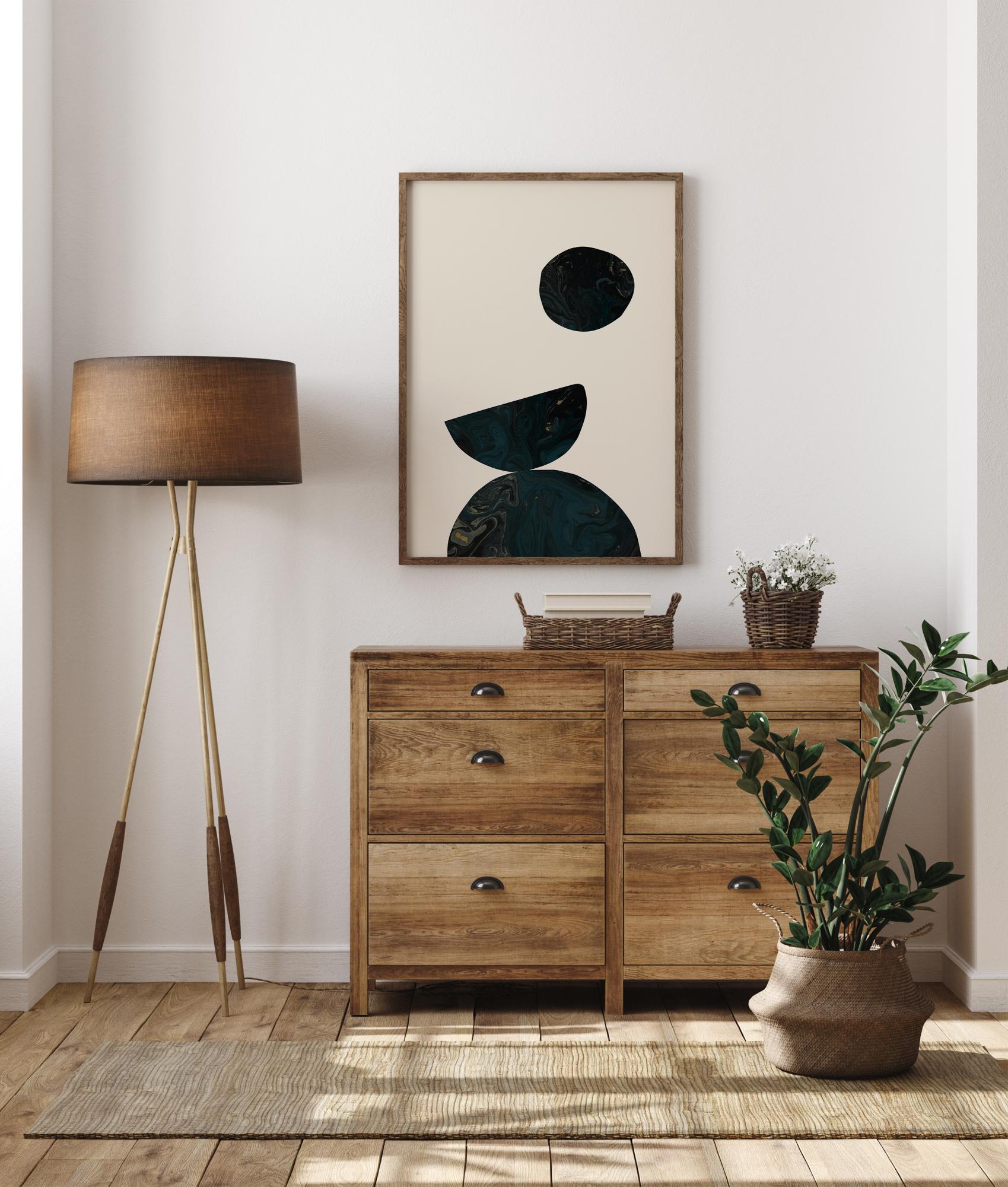 Une simple affiche abstraite avec trois demi-cercles différents. Chaque demi-cercle est d'une nuance de gris différente, allant du noir en bas au gris clair en haut. Ils s'équilibrent les uns les autres, ce qui confère à l'œuvre un sentiment de stabilité.