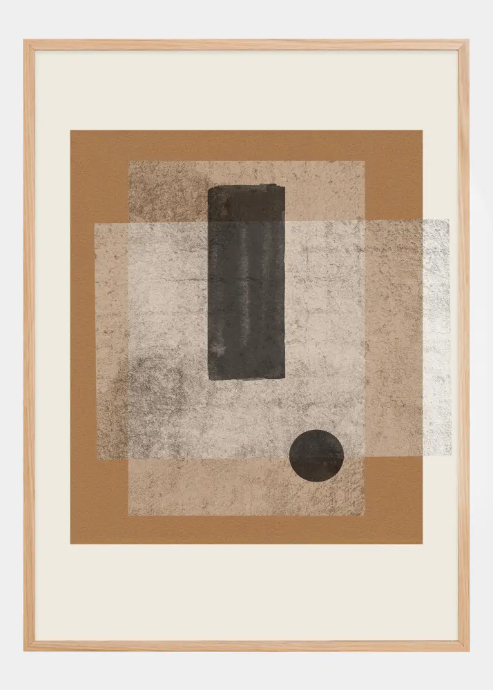 Cette affiche est un hommage aux maîtres de l'art abstrait, dont les œuvres jouent avec la forme et la texture pour créer équilibre et profondeur. Les rectangles qui se chevauchent dans des nuances de brun, noir et gris créent une sensation d'espace et de dimension, tandis que le cercle solitaire ajoute une dynamique subtile mais puissante à la composition.