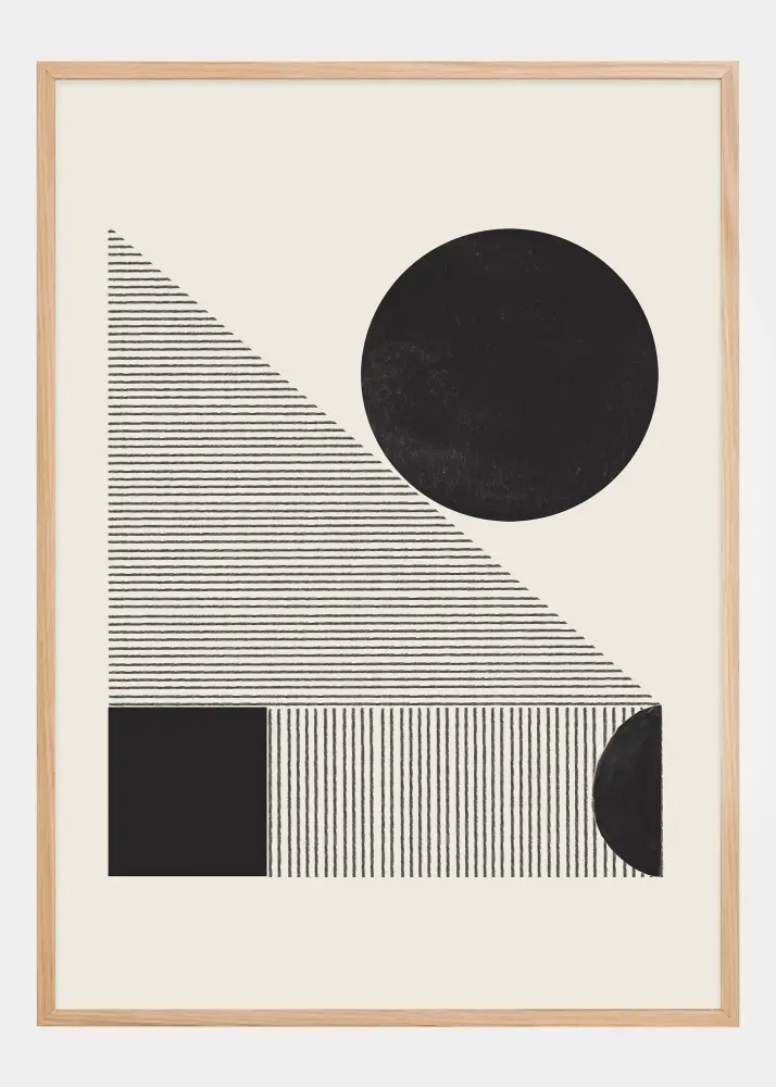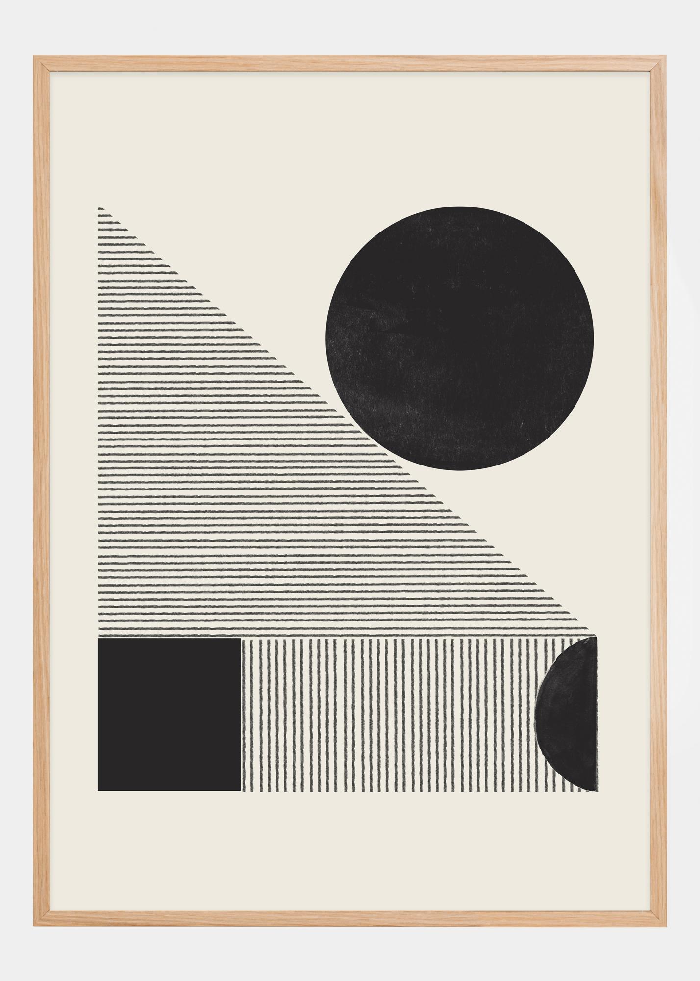 Ce poster est une interprétation ludique et sophistiquée de l'abstraction géométrique. Les lignes noires et blanches interagissent dans un motif de formes soigneusement équilibré, tandis que le grand cercle noir domine la partie supérieure de la composition, créant un point d'ancrage visuel puissant. Le jeu contrasté entre les zones noires intenses et les lignes blanches invite le spectateur à explorer les différentes textures et profondeurs de l'image.