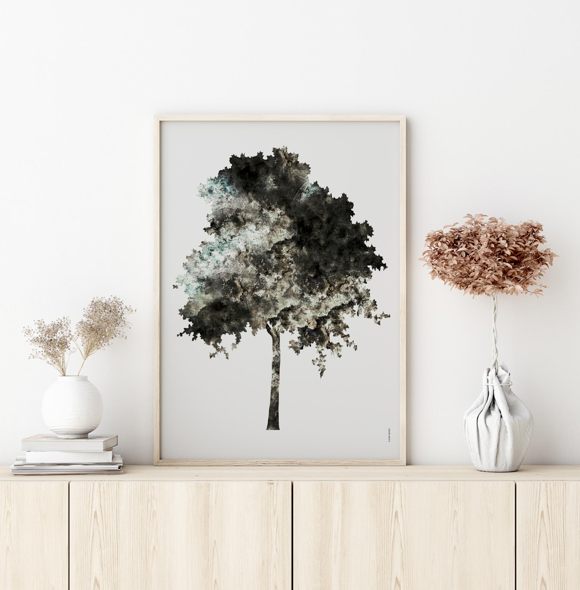 Un poster d'art graphique sous forme d'arbre, créé par l'artiste graphique Isabell Larsson, VISSLA Design Visuel. Une image merveilleusement minimaliste aux couleurs harmonieuses qui convient aussi bien dans l'entrée ou la cuisine que dans le salon, la chambre ou la bibliothèque.