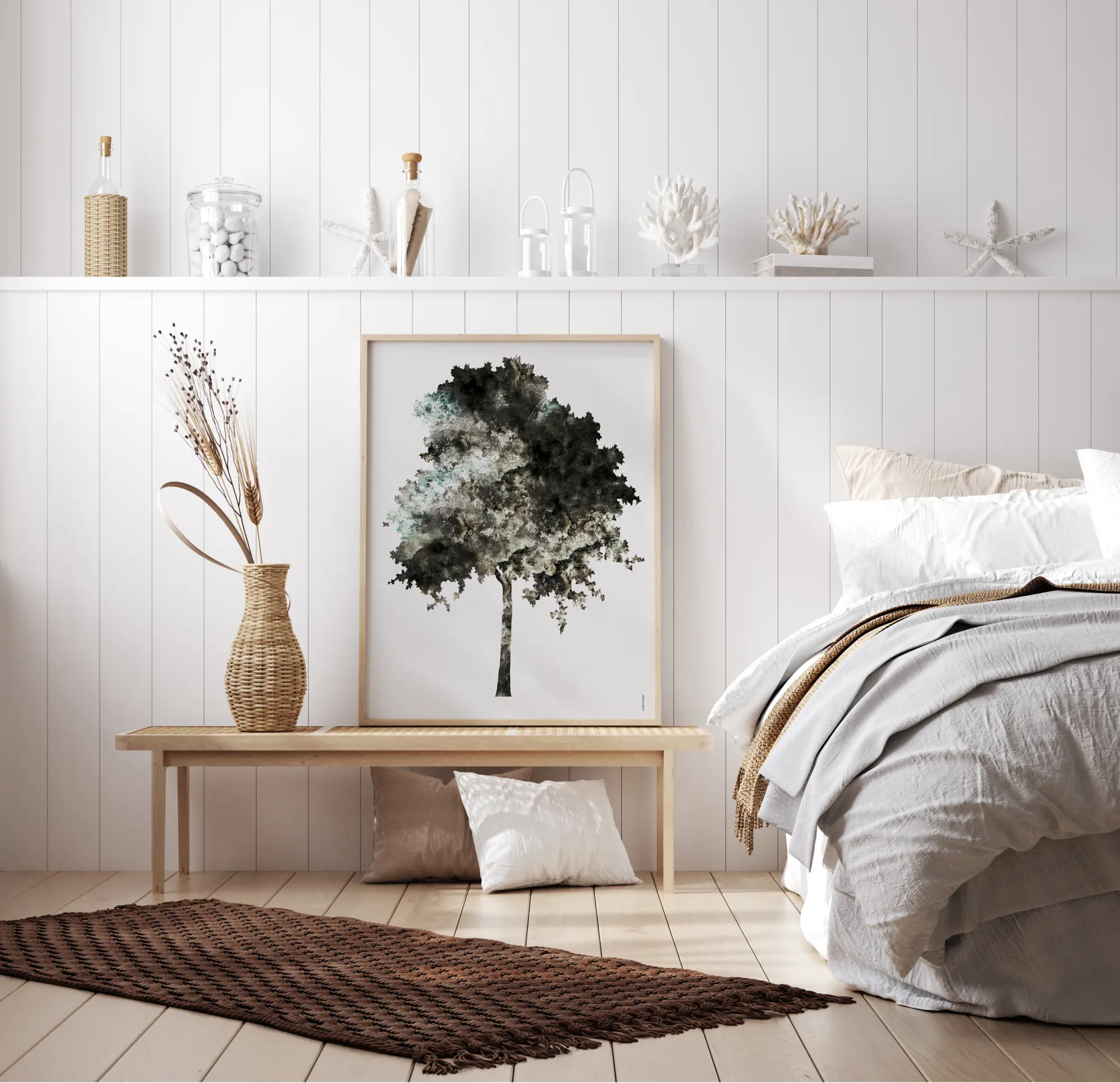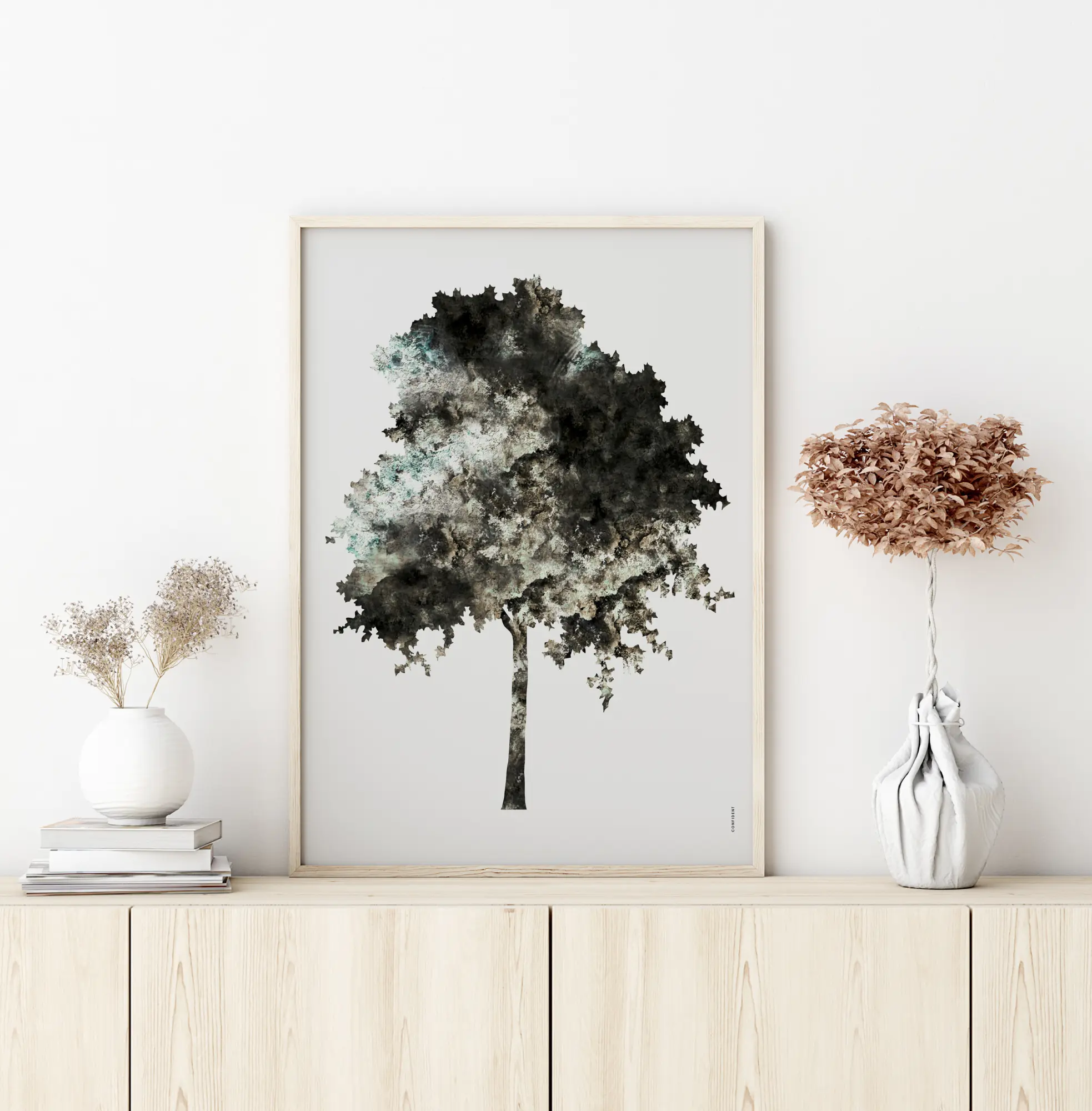 Un poster d'art graphique sous forme d'arbre, créé par l'artiste graphique Isabell Larsson, VISSLA Visuell Design. Une image merveilleusement minimaliste aux couleurs harmonieuses qui convient aussi bien dans l'entrée ou la cuisine que dans le salon, la chambre ou la bibliothèque.