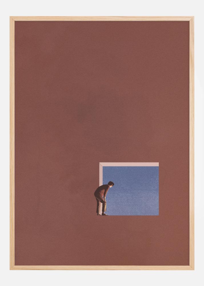 Cette affiche suggestive et conceptuelle capture une personne unique se penchant en avant, regardant à travers une ouverture carrée dans un espace bleu qui brise la surface brune environnante. Cette image simple mais puissante peut être vue comme une représentation de la curiosité et du désir humain d'explorer et de découvrir l'inconnu. Cela peut également être une métaphore de la fenêtre des opportunités et de l'importance de saisir sa chance lorsqu'elle se présente.