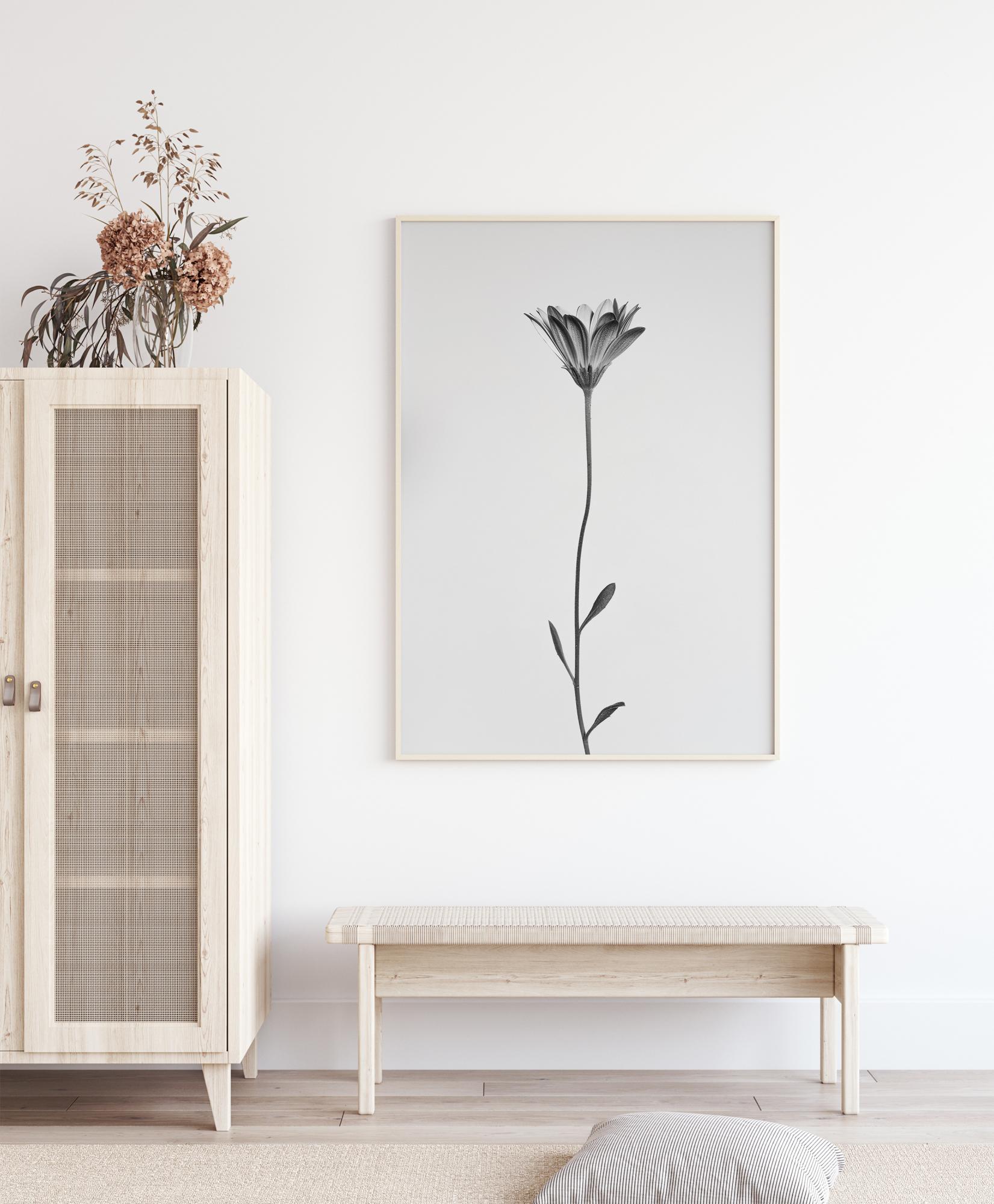 Une affiche en gros plan d'une longue marguerite sur un fond blanc épuré. L'élégance simple de cette fleur est la touche parfaite pour ajouter un petit quelque chose à votre salle de bains ou votre cuisine minimaliste.