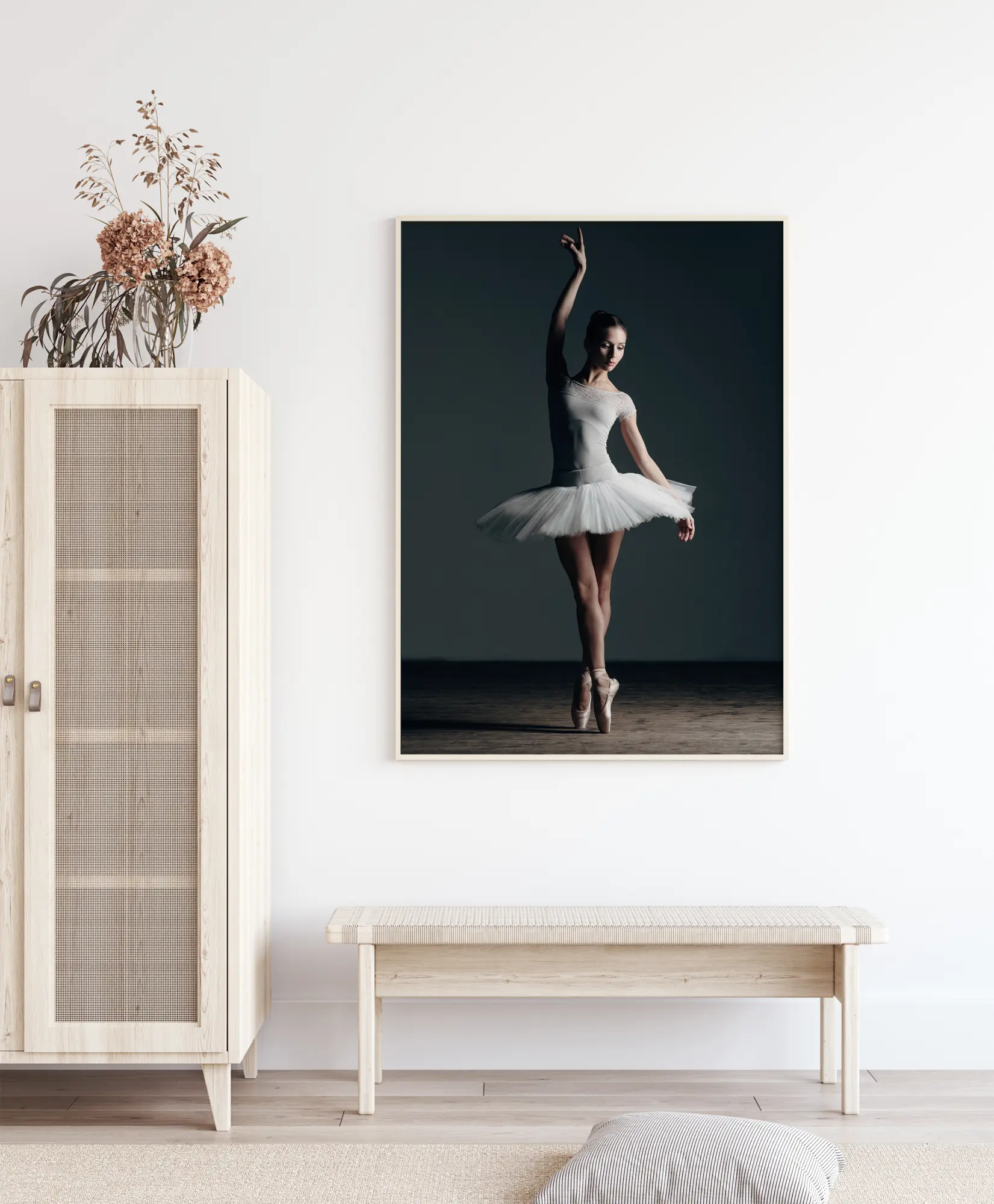 Un poster photographique d'une gracieuse danseuse de ballet debout sur la pointe des pieds avec un bras étendu au-dessus de la tête. L'éclairage de l'image fait que son visage et ses vêtements blancs se détachent joliment sur le fond légèrement plus sombre