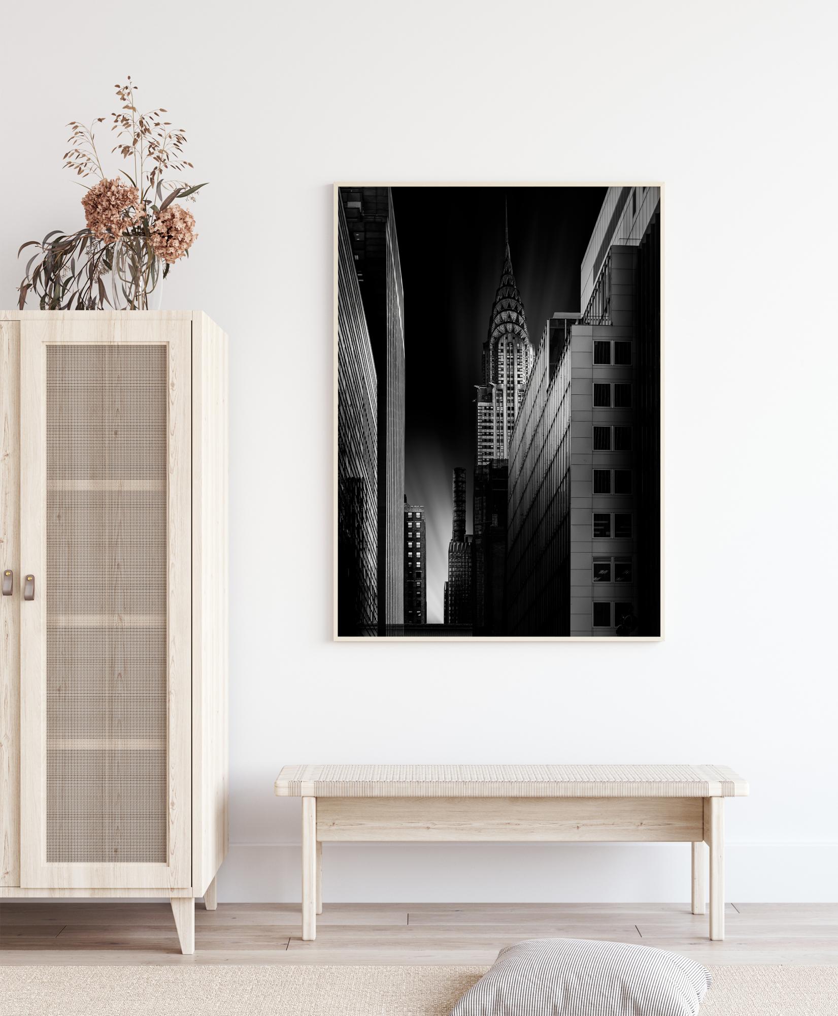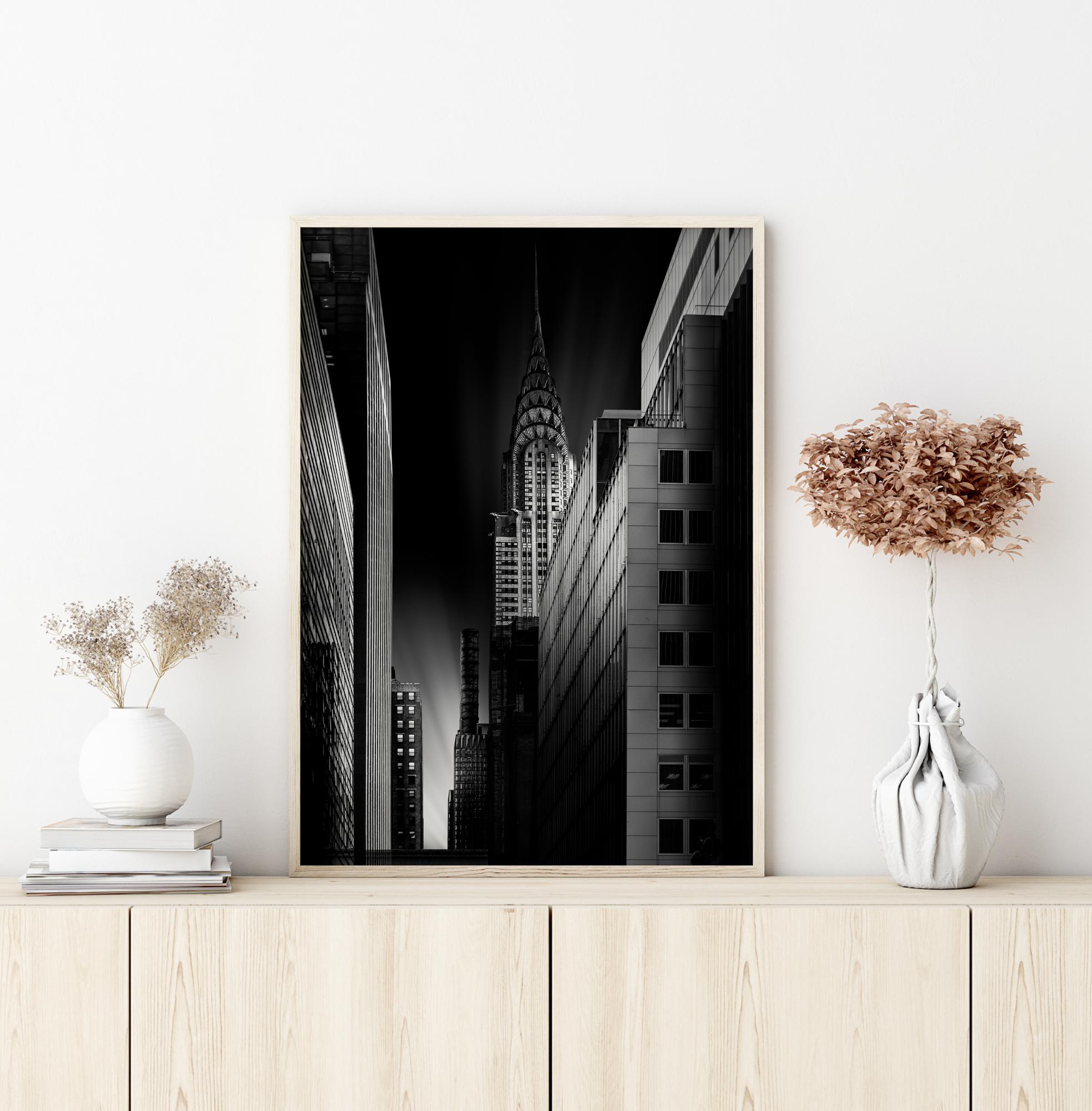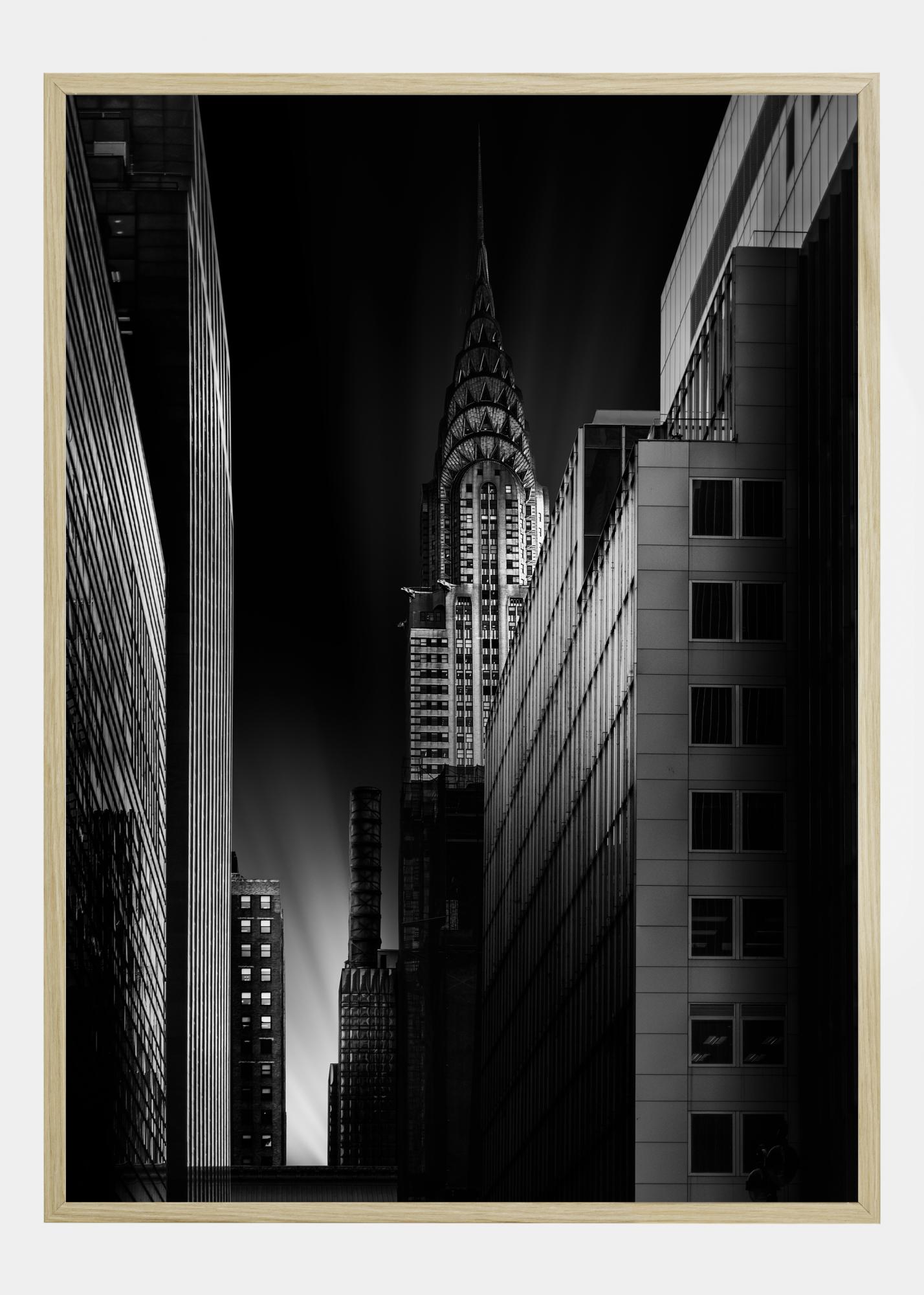 Une affiche urbaine de l'immeuble Chrysler la nuit. Une rue étroite attire le regard vers le bas jusqu'à un éclat de lumière qui frappe le ciel. À droite, l'ombre du Chrysler building est visible. Accrochez cette affiche sur un mur blanc pour donner l'impression d'être dans une galerie d'art.
