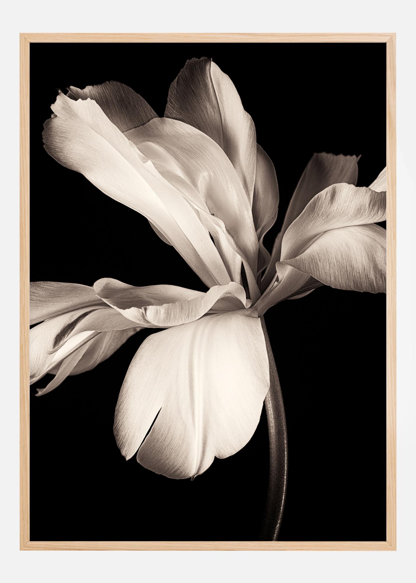 Une affiche macro d'une fleur et de ses pétales. Les doux pétales blancs pâles s'enroulent et se replient au-dessus d'une tige solide sur un fond noir simple. L'objectif macro permet de capturer les moindres détails : une excellente option pour tout amateur de fleurs. Admirez les spécificités de cette image.