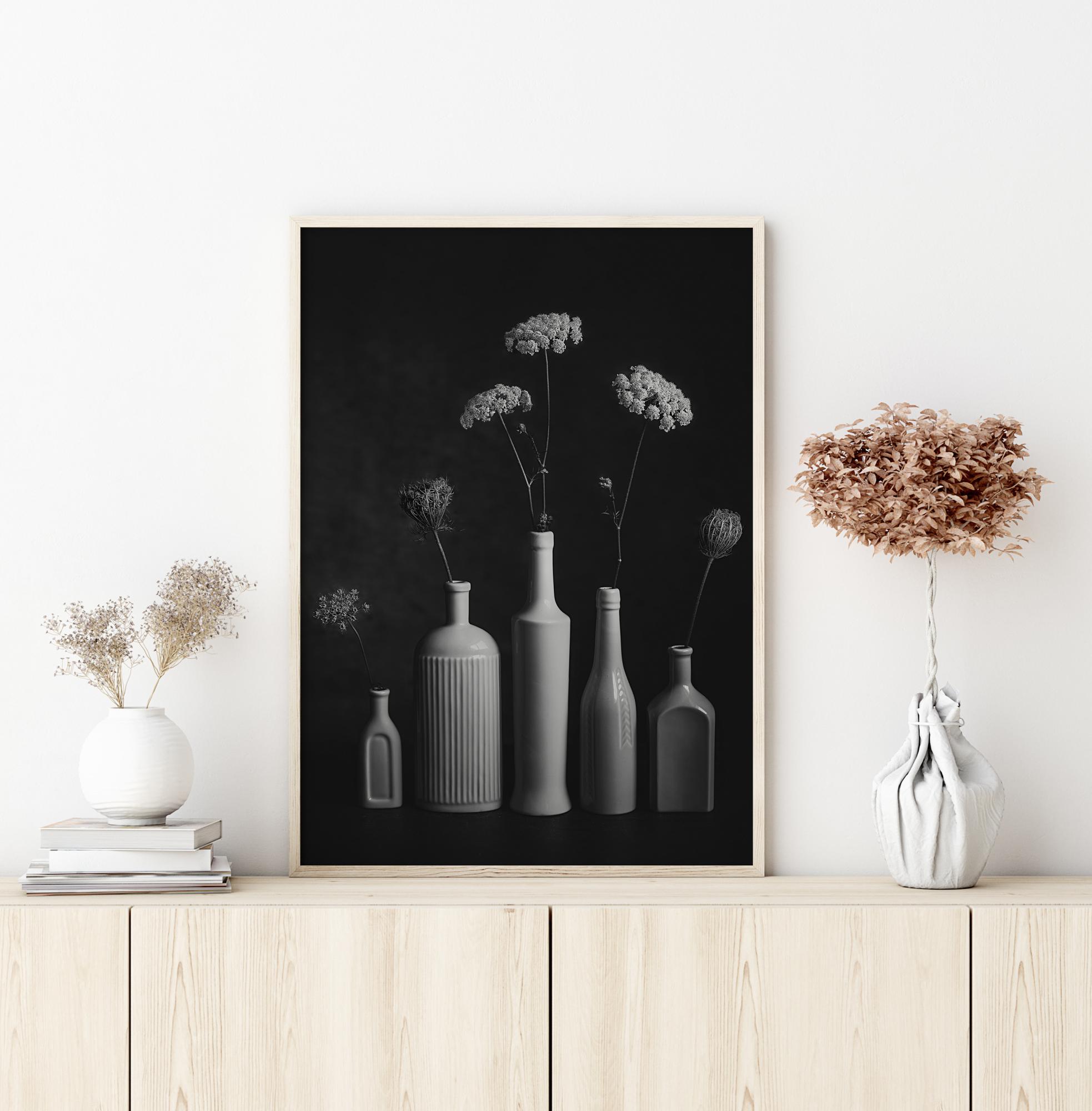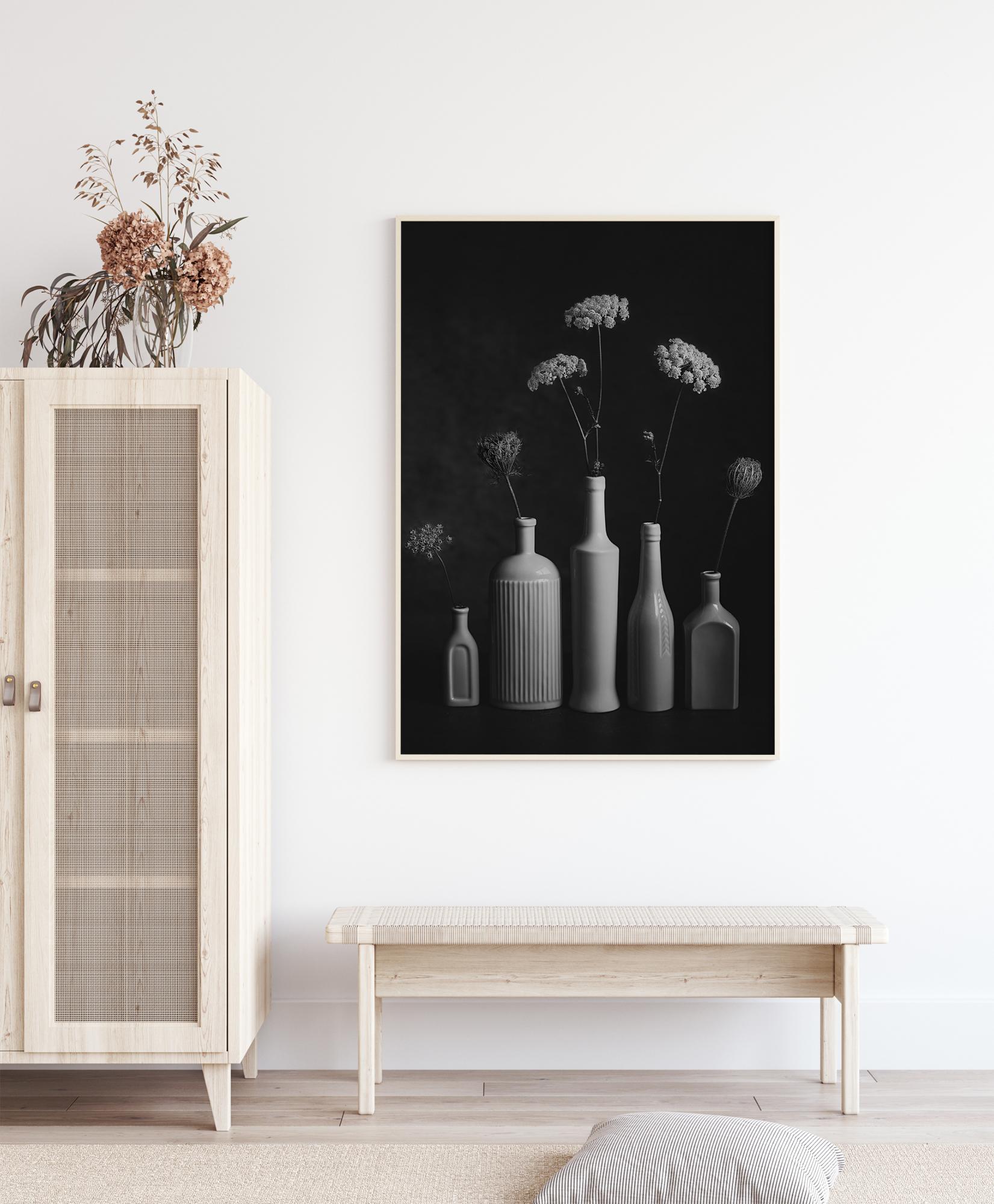 Une affiche traditionnelle de bouteilles et de fleurs sur un simple fond noir. Le style des peintres hollandais s’invite dans votre intérieur avec cet ensemble de bouteilles et de fleurs. Simple mais envoûtant.