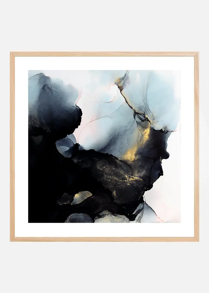 Un poster d'art abstrait en aquarelle dans des nuances de noir, bleu et or avec de légères touches de rose, créé par l'artiste Gabriella Roberg. Un beau poster qui se combine avantageusement avec d'autres de notre gamme de Gabriella Roberg.
