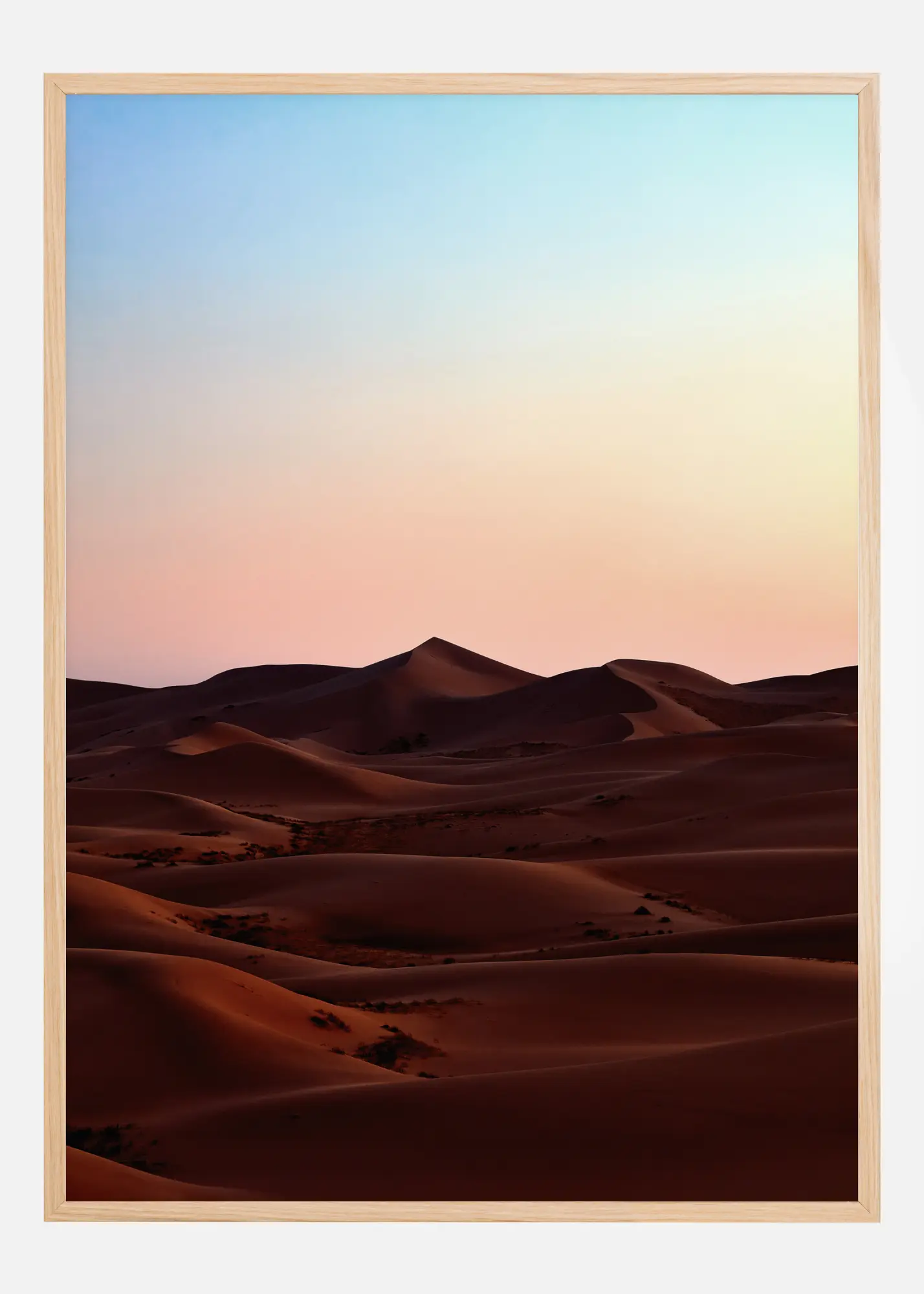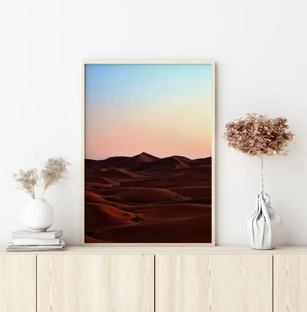 Une affiche évocatrice d'un paysage désertique. Le rouge profond du désert permet aux dunes de sable ondulantes de s'élever et de s'abaisser, attirant votre regard sur la scène. Le ciel bleu tendre et les roses brumeux contribuent à créer une ambiance matinale. Appréciez les vastes scènes de la nature en ramenant ce poster chez vous.