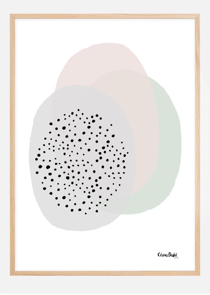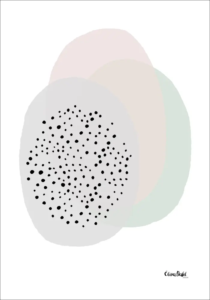 Une affiche artistique présentant une tache de forme étrange de trois couleurs différentes. L'une contient une série de petits points noirs. Le bleu, le rose et le vert des formes superposées ajoutent une touche de douceur à cette image abstraite. Faites-les ressortir davantage en choisissant un mur de couleur assortie sur lequel afficher cette œuvre.