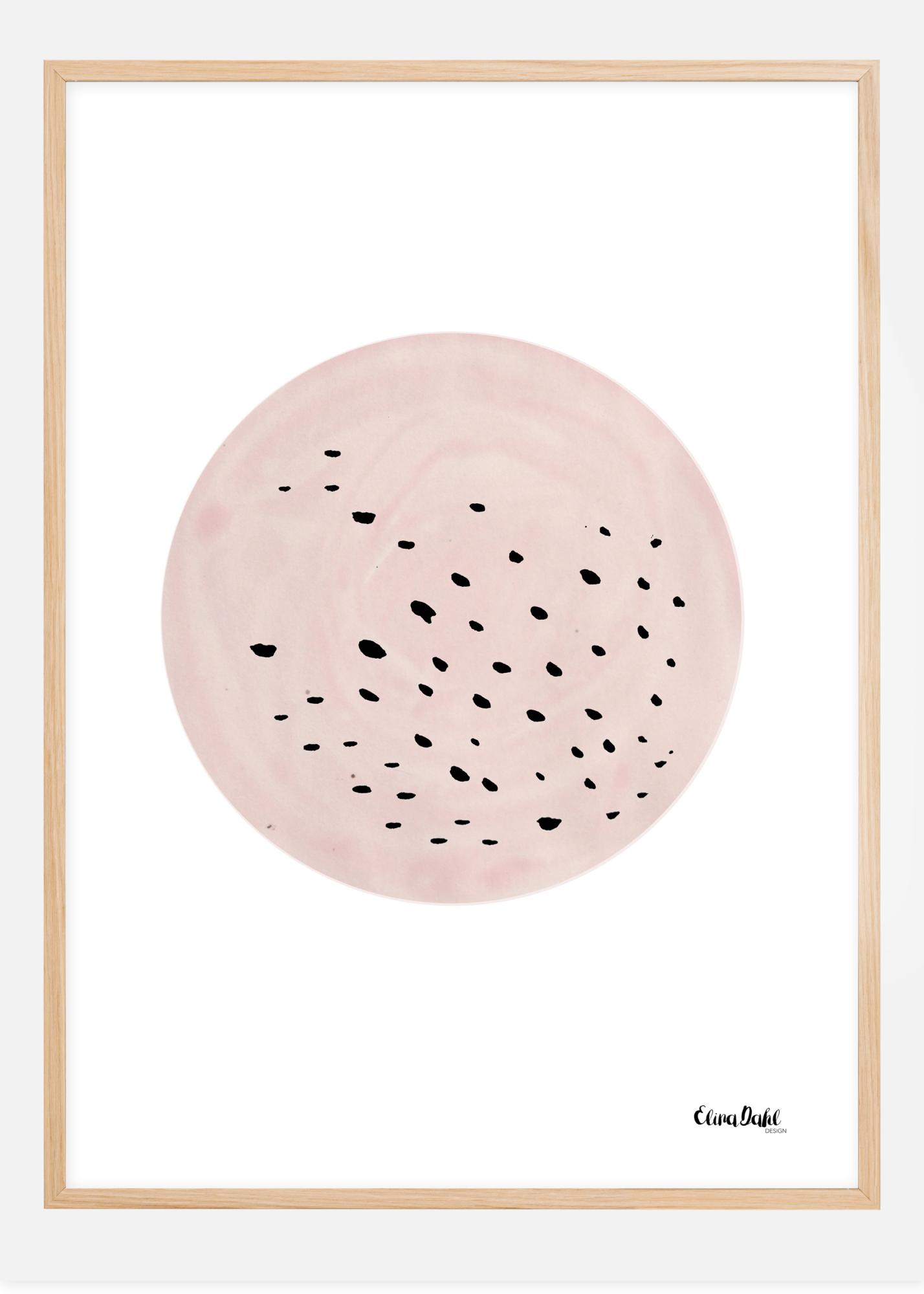 Une affiche abstraite de points noirs dans un cercle beige rosé. Le beige rosé de ce cercle est rempli de petits points mouchetant la surface. La boule est suspendue sur un fond blanc uni. Associez cette image étrange mais fascinante à un arrière-plan audacieux pour créer une œuvre d'art vraiment intéressante.