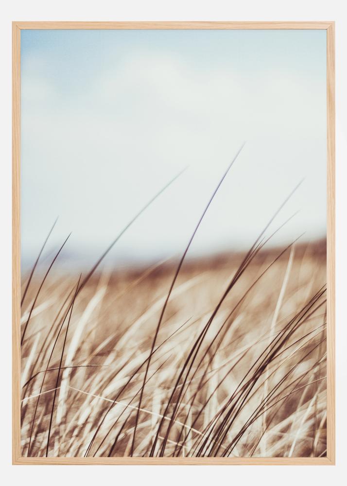 Une simple affiche de brins d'herbe dans le vent sous un ciel bleu nuageux. Les douces teintes brunes et jaunes de l'herbe, et les longues tiges, conduisent le regard vers le haut et les nuages. Envolez-vous pour le pays des rêves avec cette prairie apaisante accrochée sur votre mur.