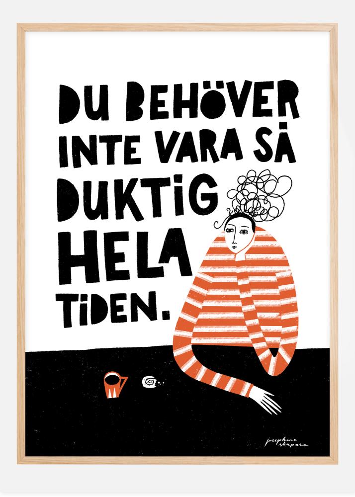 Une affiche à la fois motivante et amusante avec une femme assise à une table avec son café. “Vous n'avez pas besoin d'être bon tout le temps” en suédois est un excellent mantra. Soyez inspiré chaque matin autour d'un café et commencez votre journée de manière positive.
