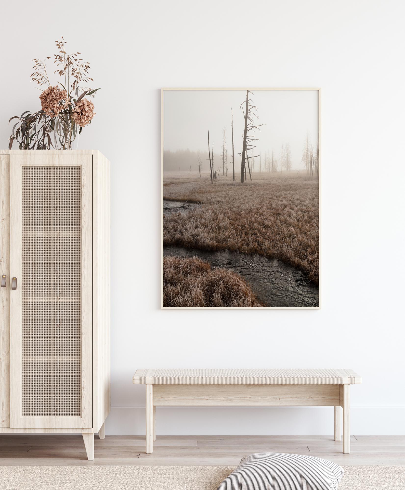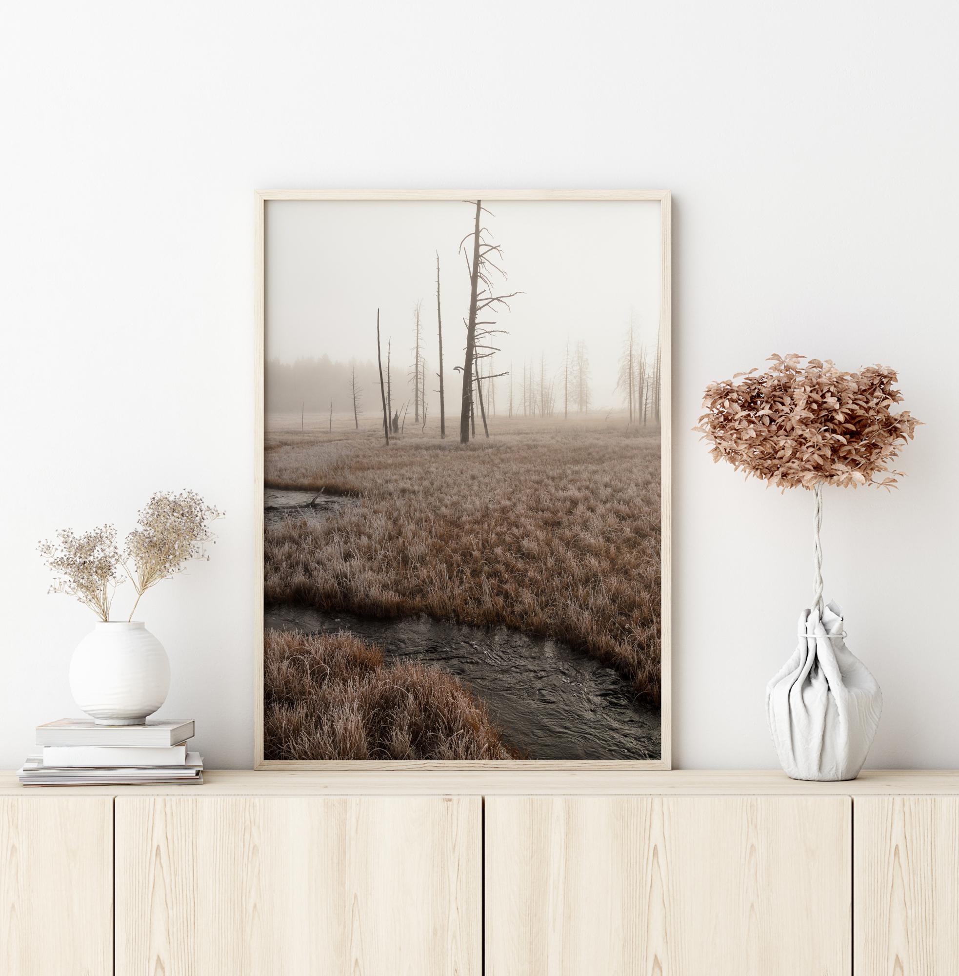 Une affiche paysage d'une plaine avec des arbres morts et un ruisseau qui la traverse. Cette photo prise tôt le matin montre la brume qui recouvre les arbres et l'herbe jaune. Suivez le cours d'eau qui serpente à travers le paysage jusqu'à la forêt lointaine. Perdez-vous ailleurs, dans un autre temps, en accrochant ce poster chez vous.