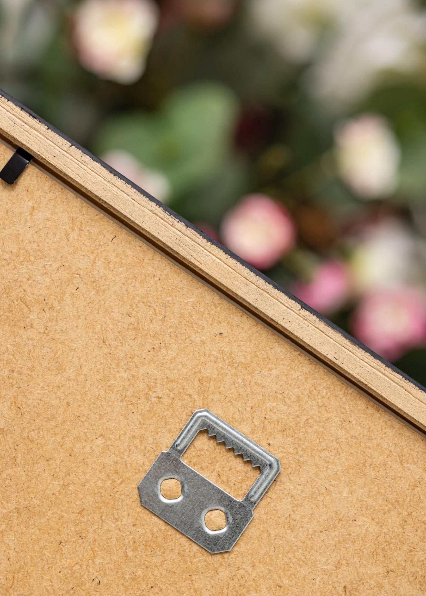 Ce cadre photo est livré avec du verre flotté, ce qui est un verre avec des propriétés lumineuses légèrement meilleures que le verre ordinaire, et protégeant également des UV jusqu'à 40 à 45 %. Le carton de fond brun est fabriqué en MDF et est doté de boucles de suspension pour un positionnement possible à la verticale comme à l'horizontale. Le carton de fond est maintenu en place à l'aide des petites broches en métal que vous ouvrez facilement lorsque vous insérerez votre image. Le cadre a une profondeur de feuillure (profondeur interne) de 8 mm et suffisamment de place dans le cas où vous désirerez compléter votre motif avec un élégant passe-partout.