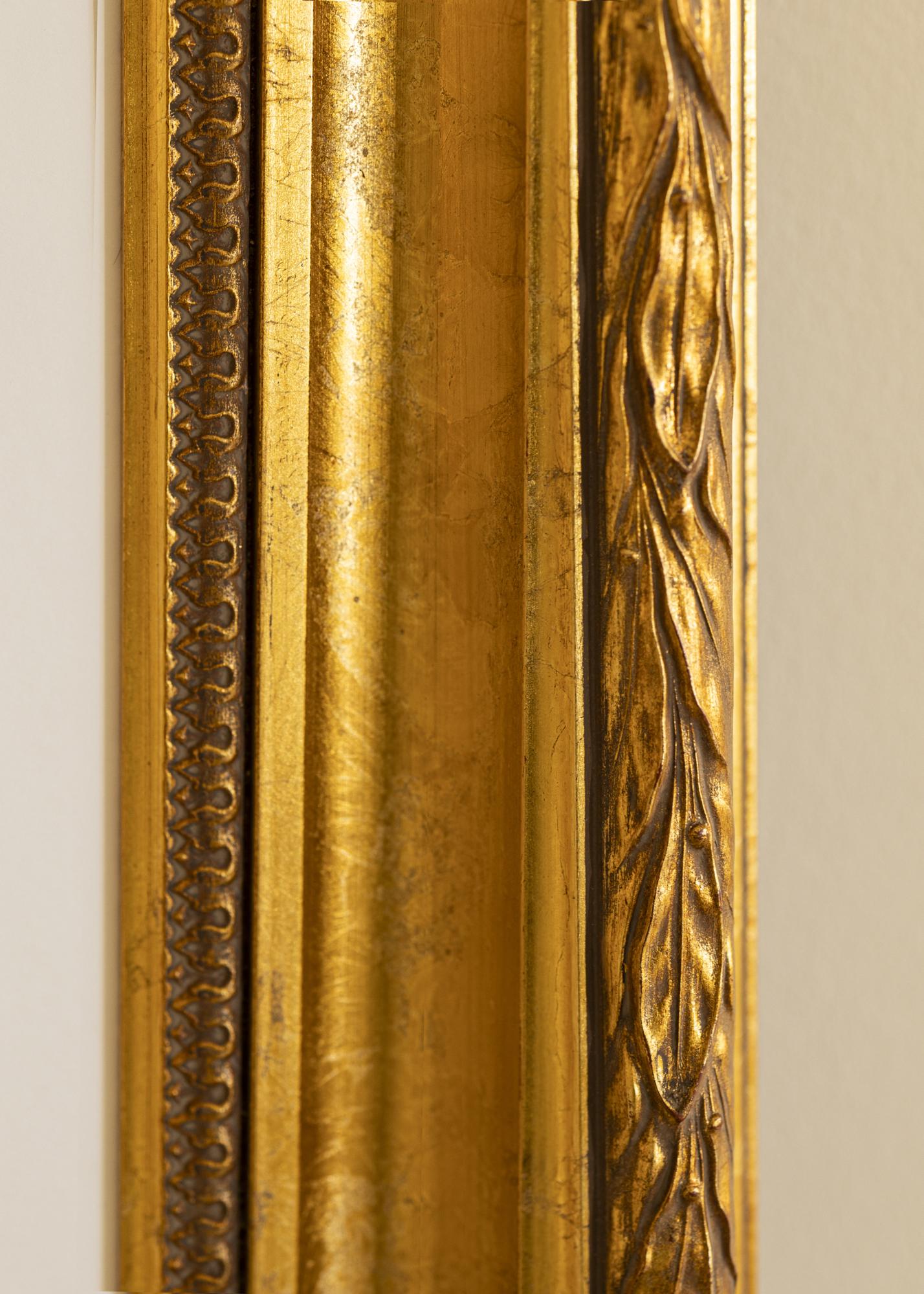 Le profil large de 102 mm donne au cadre une présence impressionnante, tandis que sa profondeur de 56 mm crée un encadrement robuste et stable. Les petits ornements en forme de perles le long du bord intérieur ajoutent une touche subtile et classique qui améliore l'impression générale. Le bord extérieur est décoré d'un motif de feuilles ondulantes, ce qui confère au cadre un caractère sophistiqué et intemporel.