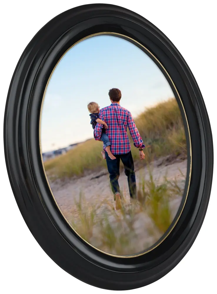 Eiri Mozart est un superbe cadre ovale noir fabriqué en Finlande, ce qui garantit une très haute qualité. Hormis une fine bordure dorée au plus près du motif, le cadre est entièrement en noir.