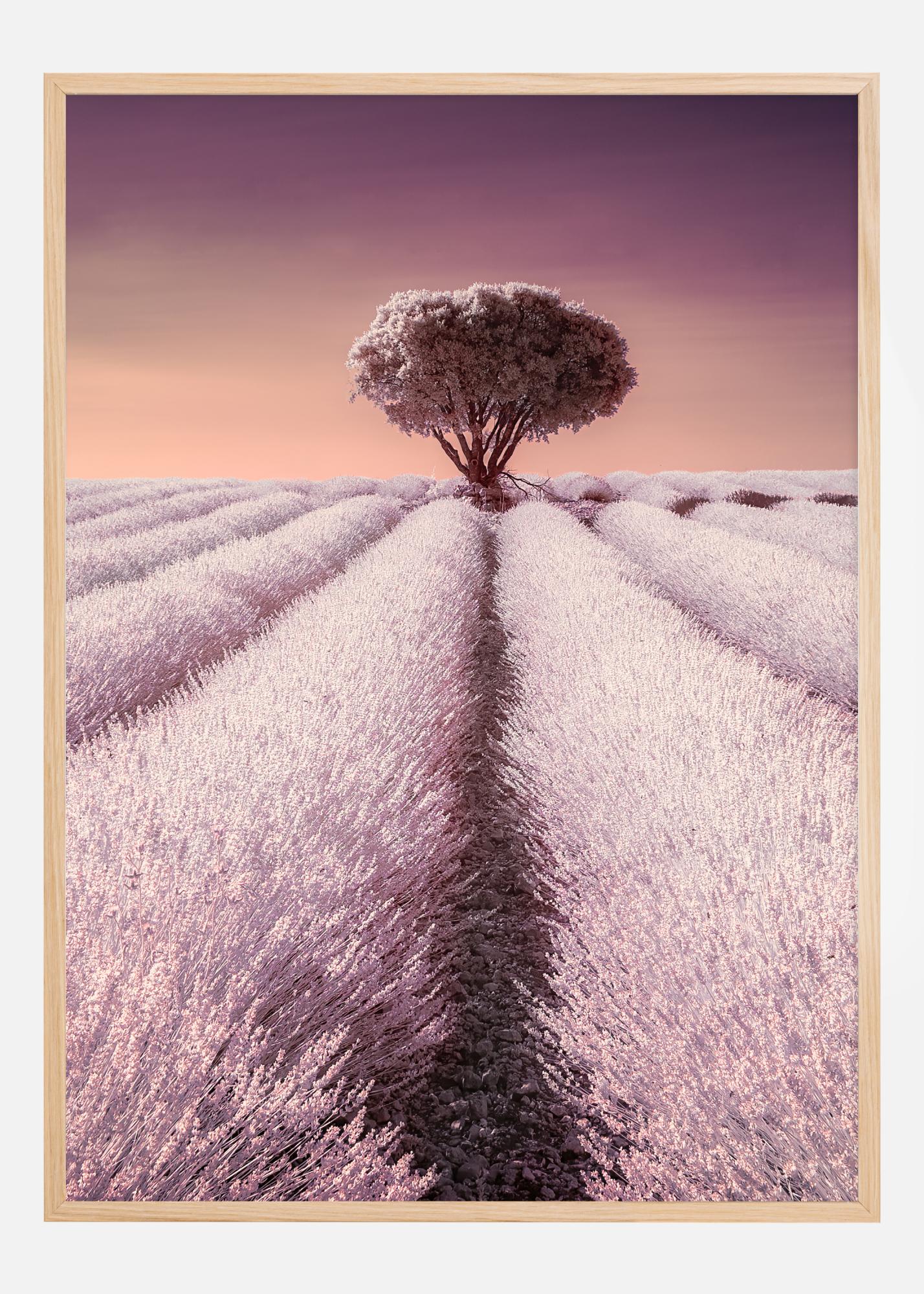 Entrez dans un monde de rêve de couleur et de fantaisie avec notre affiche exclusive. Cette impression dégage une sensation magique avec son ciel aux couleurs pastel qui passe du rose chaud à des nuances apaisantes de violet. Le motif met en valeur un arbre solitaire, majestueusement centré le long de la ligne pure du chemin d'un champ de lavande. Cette affiche est une fête visuelle pour les yeux et conviendrait parfaitement comme image centrale dans n'importe quelle pièce, apportant une touche de calme et de beauté.
