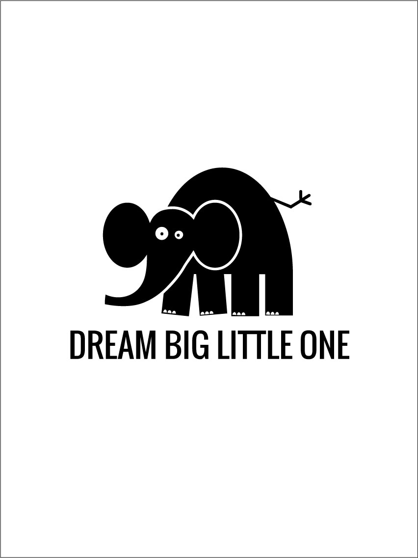 Poster moderne noir et blanc pour la chambre d'enfant avec un éléphant amusant qui encourage le petit à rêver grand dans la vie. Le motif est graphique et épuré, ce qui fait qu'il s'adapte à toutes les chambres d'enfants. Le poster se prête bien comme tableau unique au-dessus du lit ou associé à d'autres prints sur un mur plus long et peut être avantageusement combiné avec le poster Dino Favorite, Kanin Happy, Hund Little, Superhero ou Pingvin Cool.