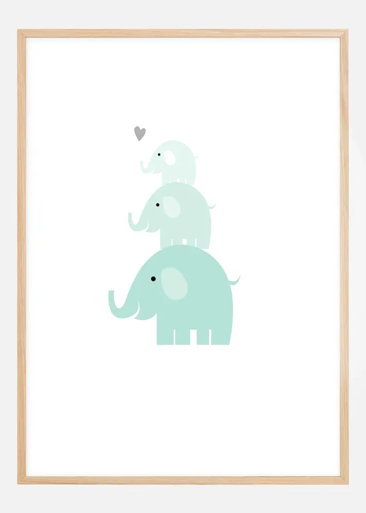 Poster avec un motif imprimé représentant un trio de mignons éléphants dans une nuance de bleu glace empilés les uns sur les autres sur du papier blanc. Idéal pour ceux qui aiment tous les animaux de la savane, mais convient peut-être avant tout aux chambres des plus jeunes enfants. Le poster peut être combiné avec d'autres posters d'animaux ou d'éléphants dans le même jeu de couleurs, pour créer une merveilleuse ambiance de conte de fées dans la chambre d'enfant.