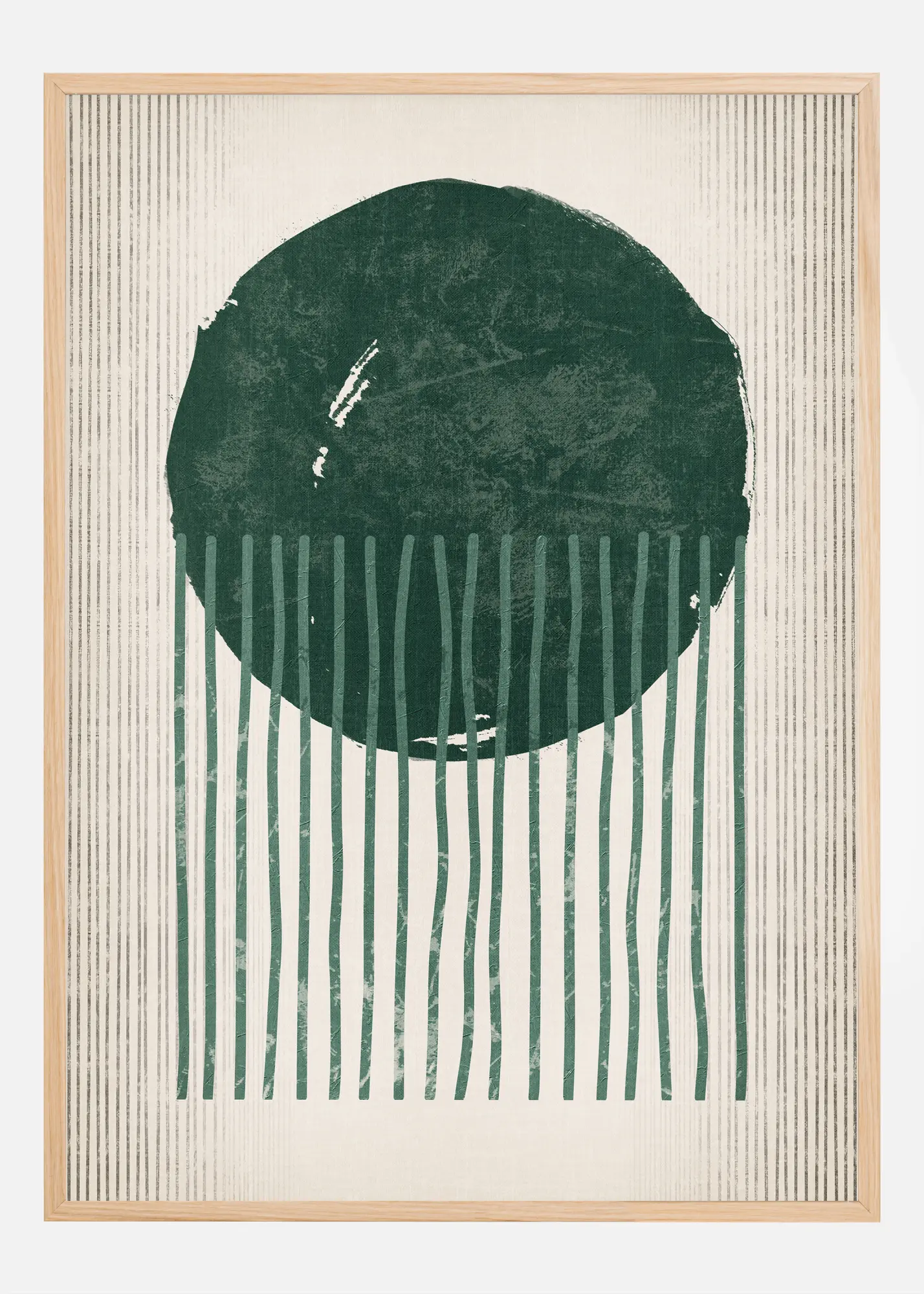 Cette affiche invite à une exploration imaginative du monde marin, avec une image stylisée qui évoque une méduse aux tentacules ondulants. La forte forme circulaire en vert émeraude est à la fois captivante et apaisante, tandis que les lignes verticales blanches formant les 'tentacules' créent une sensation de mouvement. C'est une interprétation artistique qui combine forme abstraite et fantaisie biologique, offrant une touche unique et moderne sur le thème marin.