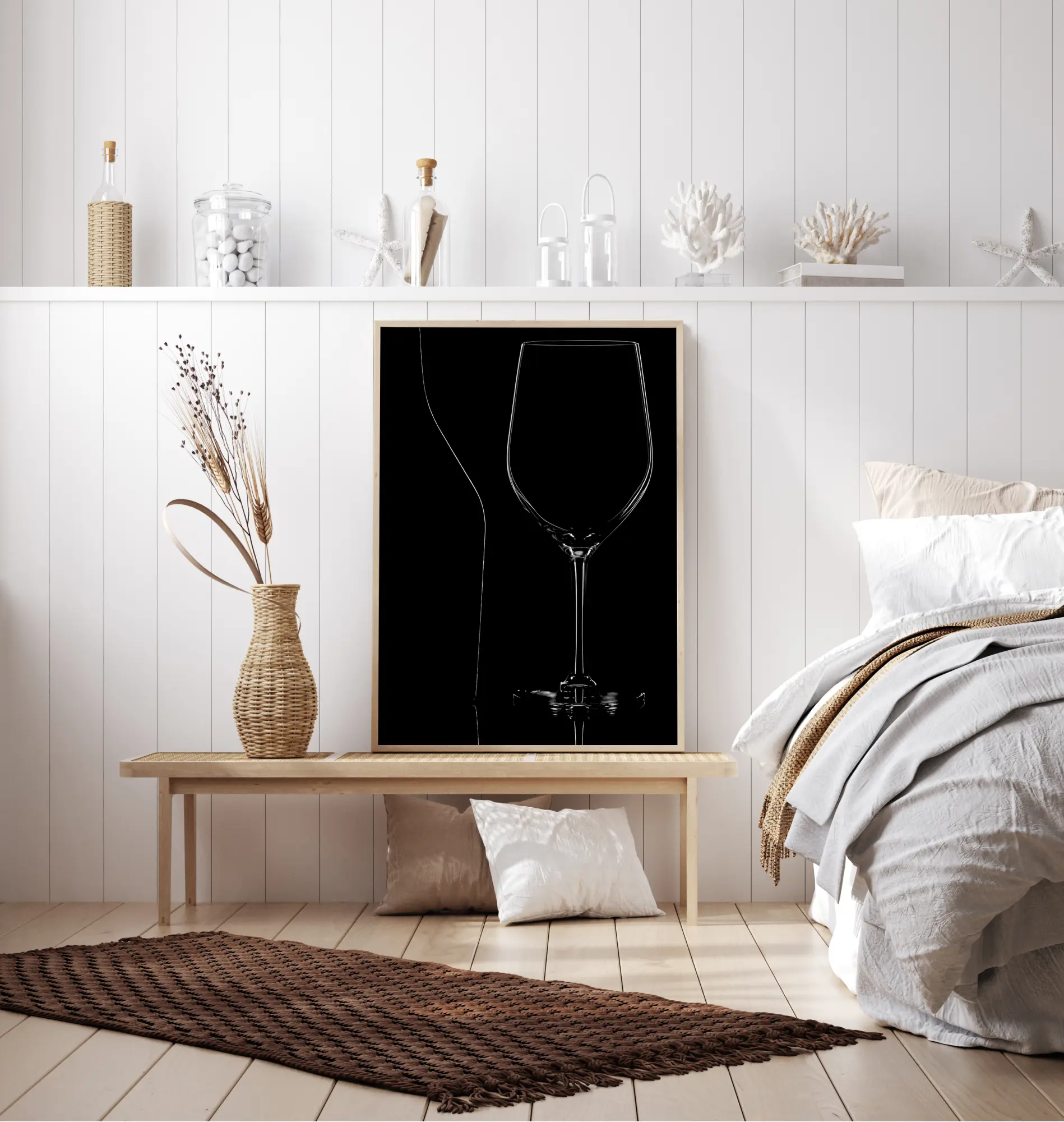 Une jolie affiche avec un verre à vin sur un fond noir. Cette œuvre abstraite transpire la classe, car la seule façon de voir le verre est la lumière réfléchie sur le bord. Associez-le à un mur blanc pour conserver cette élégance spectaculaire.
