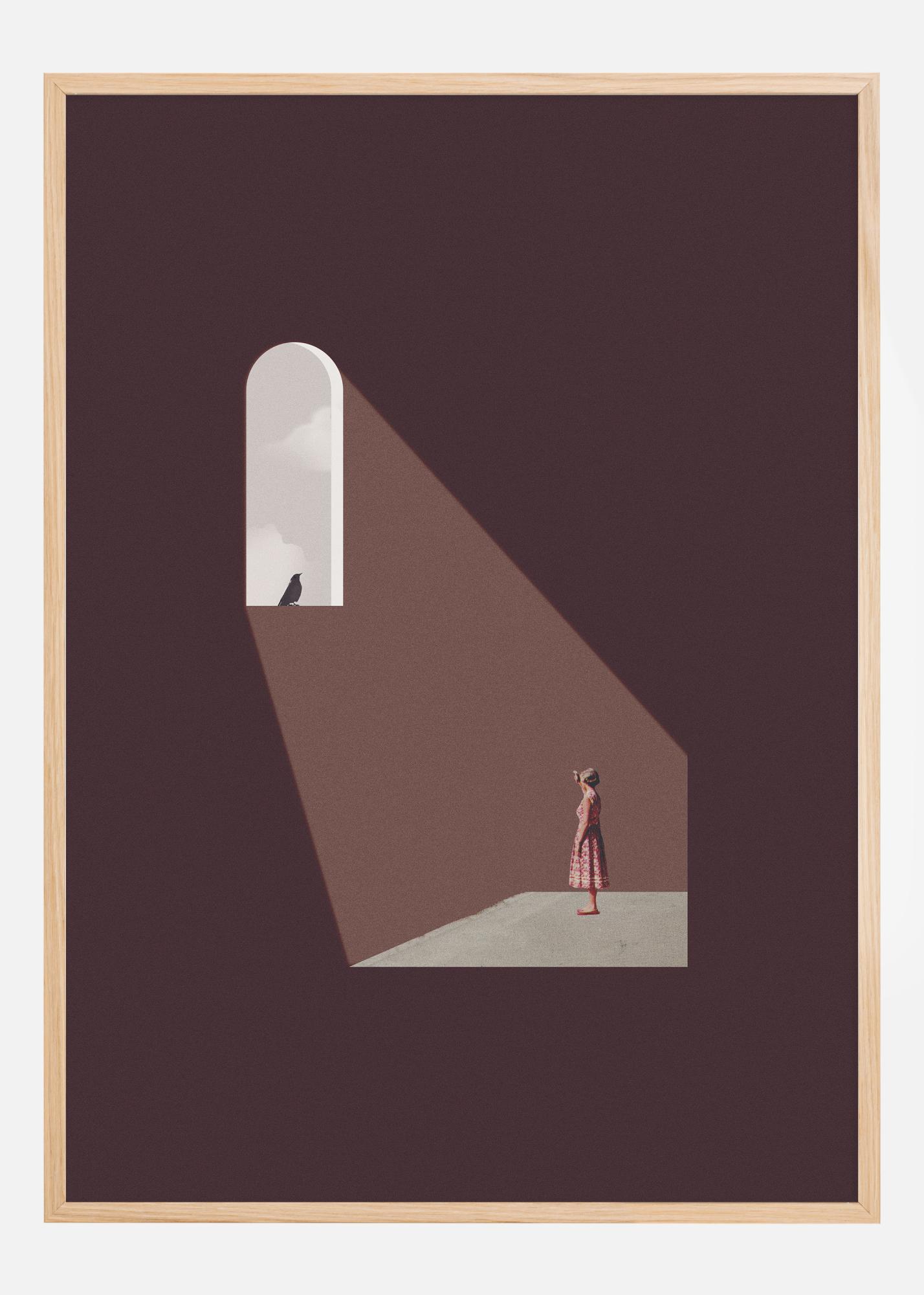 Ce poster minimaliste capture un moment de tranquillité et de réflexion. Une silhouette unique se tient sous un rayon de lumière qui s'infiltre par une fenêtre, symbolisant l'illumination et la réflexion. L'image est saturée de tons bruns et beige doux, créant une atmosphère chaleureuse et accueillante.
