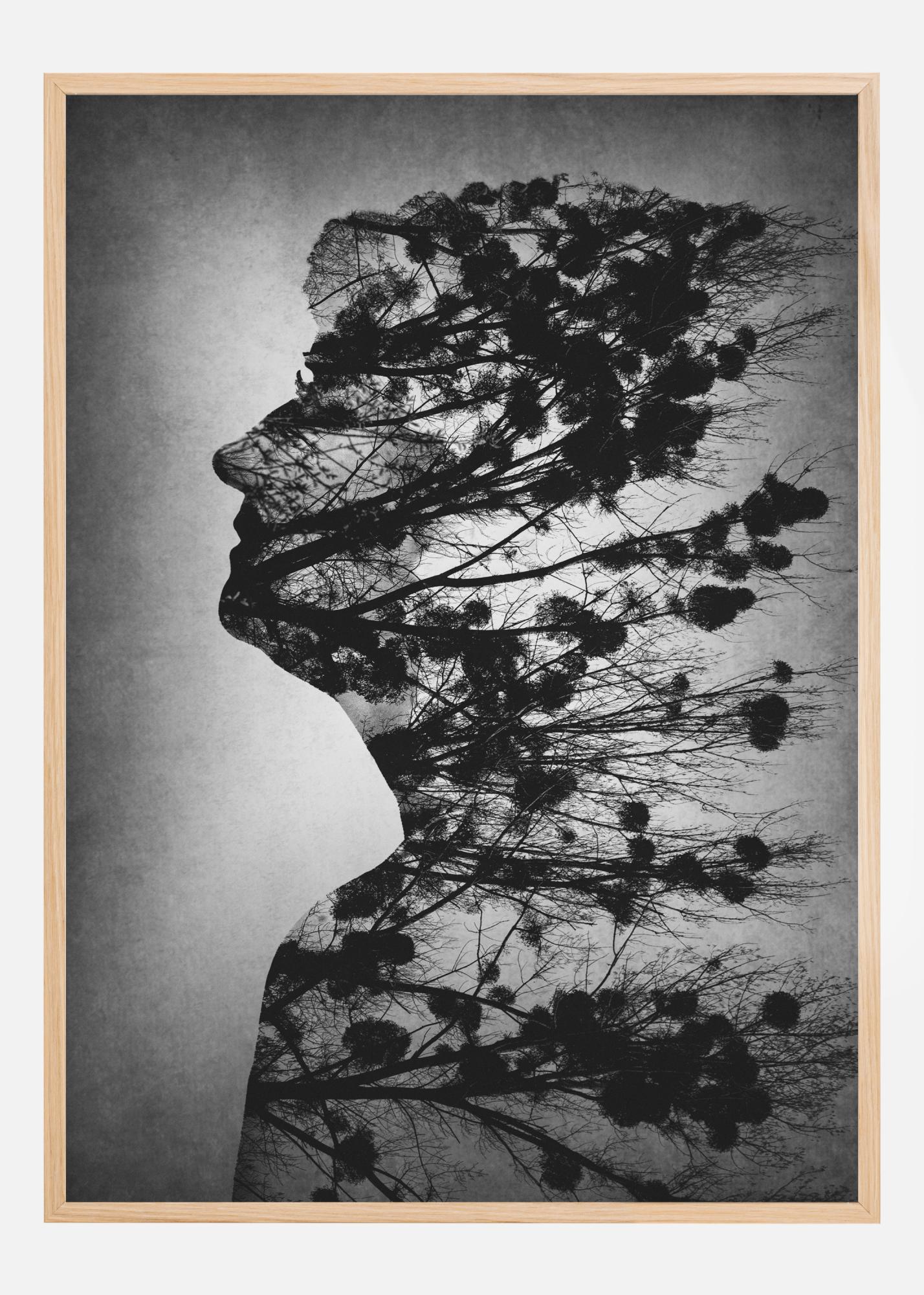 Une affiche abstraite du visage d'une femme créé en utilisant différentes feuilles et branches. Dans un superbe noir et blanc, cette pose spectaculaire donne l'impression que le vent a soufflé ces feuilles sur son visage. Un contre-jour met en évidence son profil, ce qui donne une impression de force et de transparence.