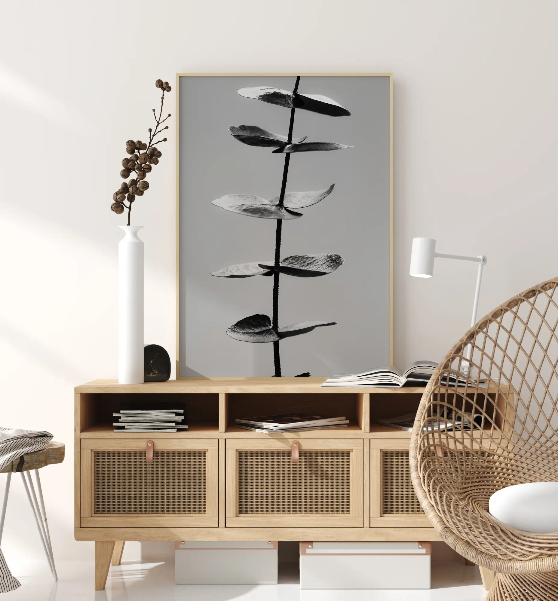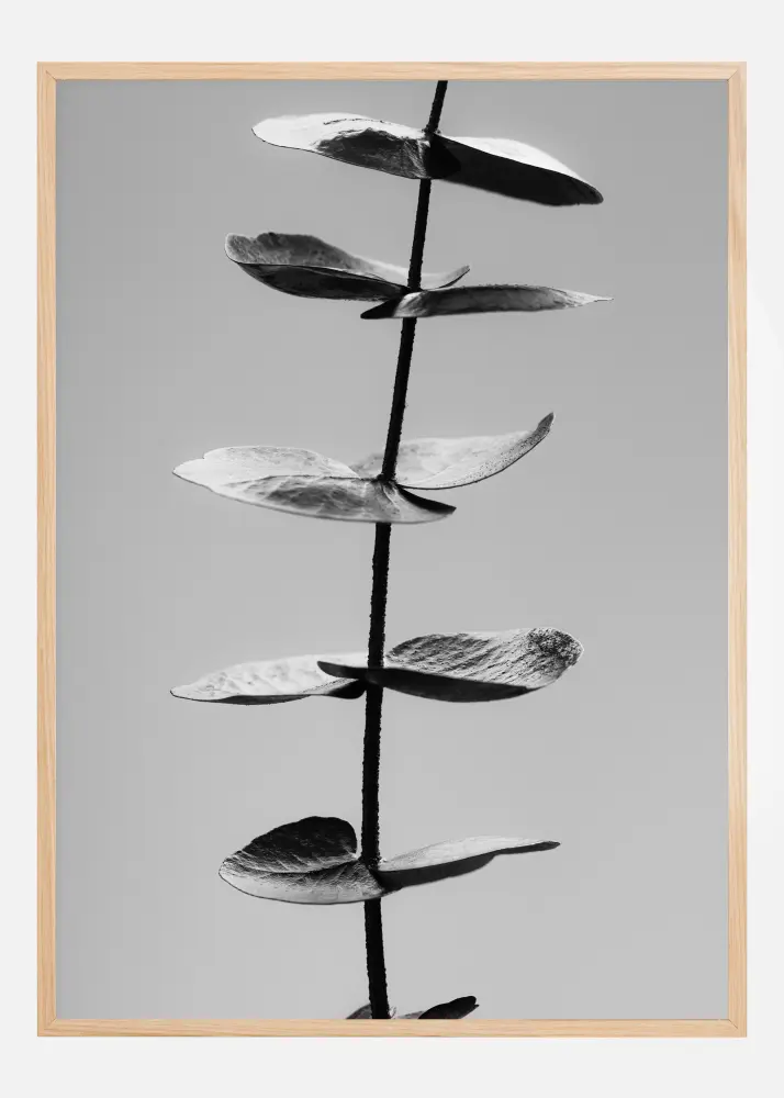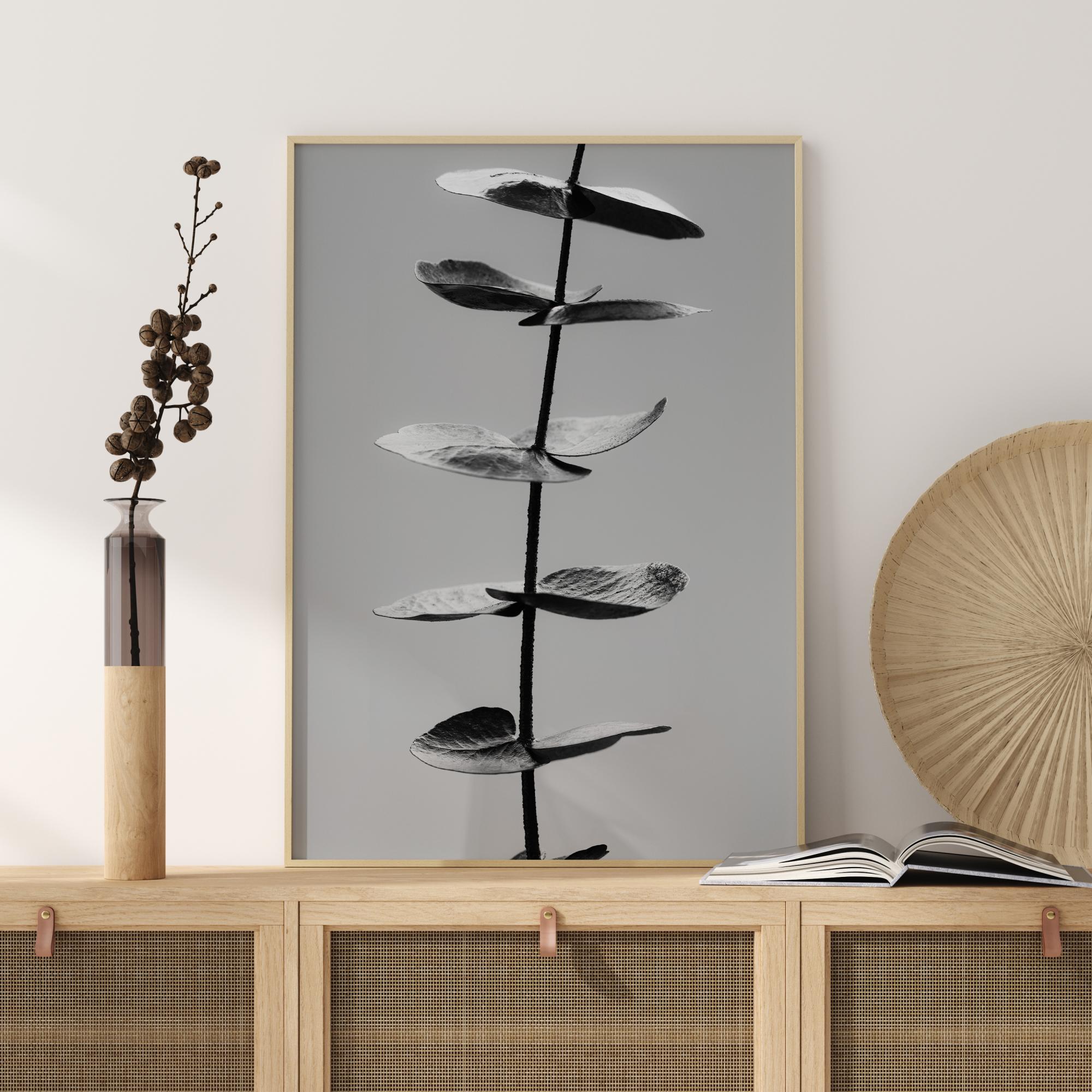 Une affiche simple et nature représentant une branche d'eucalyptus en pleine croissance. L'élégant noir et blanc de cette œuvre minimaliste trouvera sa place dans une pièce verte où la lumière chaude du soleil aura un effet apaisant.