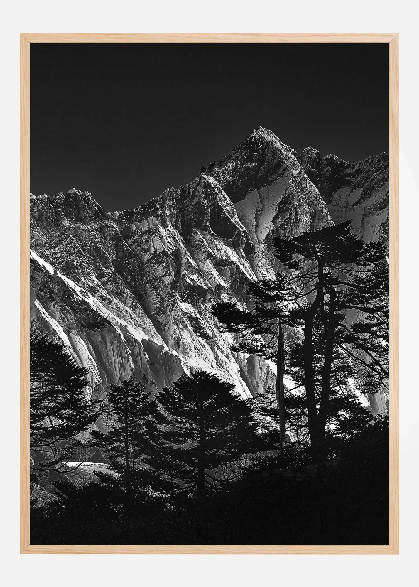 Une affiche montagne représentant le flanc du Mont Everest. Cette photo spectaculaire en noir et blanc montre les flancs abrupts de la montagne dans un blanc éclatant. Des arbres sombres se trouvent au premier plan et un ciel tout aussi sombre entoure la montagne derrière. Ressentez le drame et le danger dans cette image.