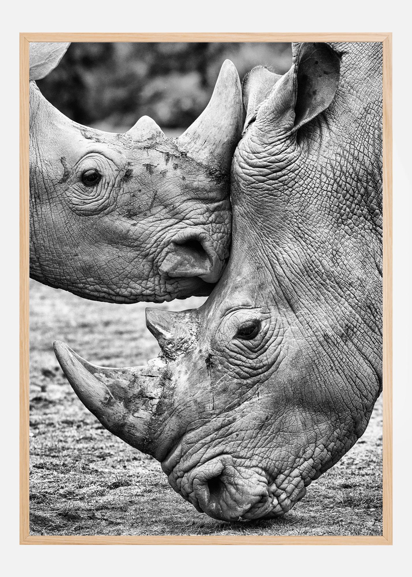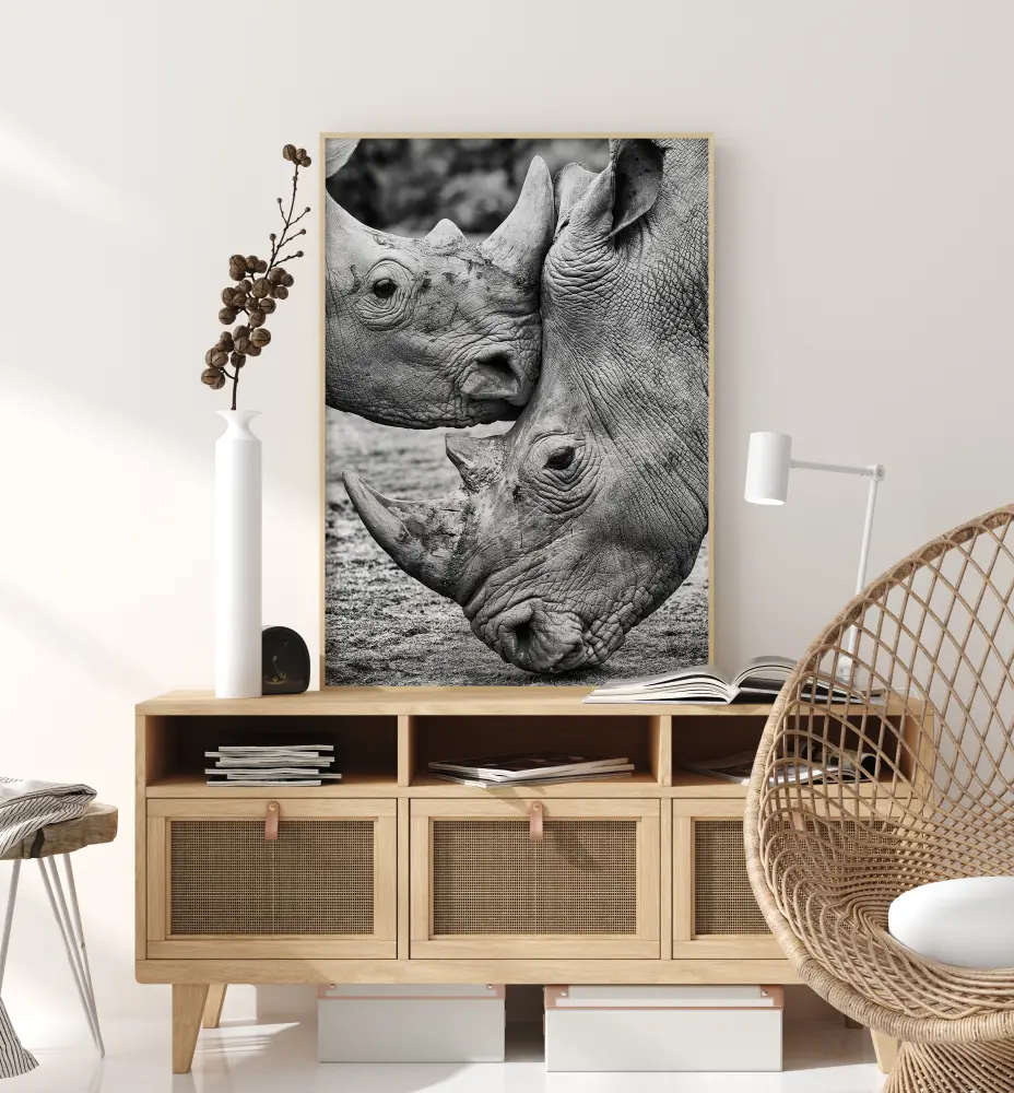 Une affiche majestueuse de deux rhinocéros qui se retrouvent face à face. Sentiment de crainte et émerveillement de la nature à la fois. Ressentez et appréciez la tranquillité dans votre maison grâce à ce poster étonnant.