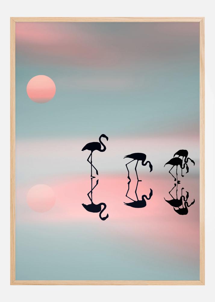 Une affiche vibrante de quatre flamants roses se nourrissant sur un lac pastel pâle. La lumière bleue, rose et pêche crée une image douce alors que les silhouettes de cette famille de flamants traversent doucement le lac. Vous pouvez presque sentir la paix dans cette image douce et subtile.