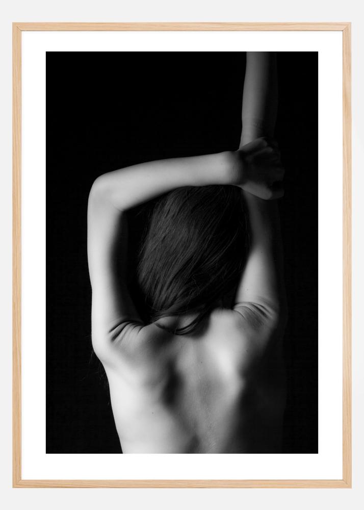 Un portrait du dos d'une femme. Cette image en noir et blanc met en évidence les muscles souples de son dos alors qu'elle lève un bras et plie l'autre au-dessus de sa tête. Certaines parties d'elle sont enveloppées d'ombre. Emportez cette image chez vous pour en faire un dessin artistique dans votre maison.
