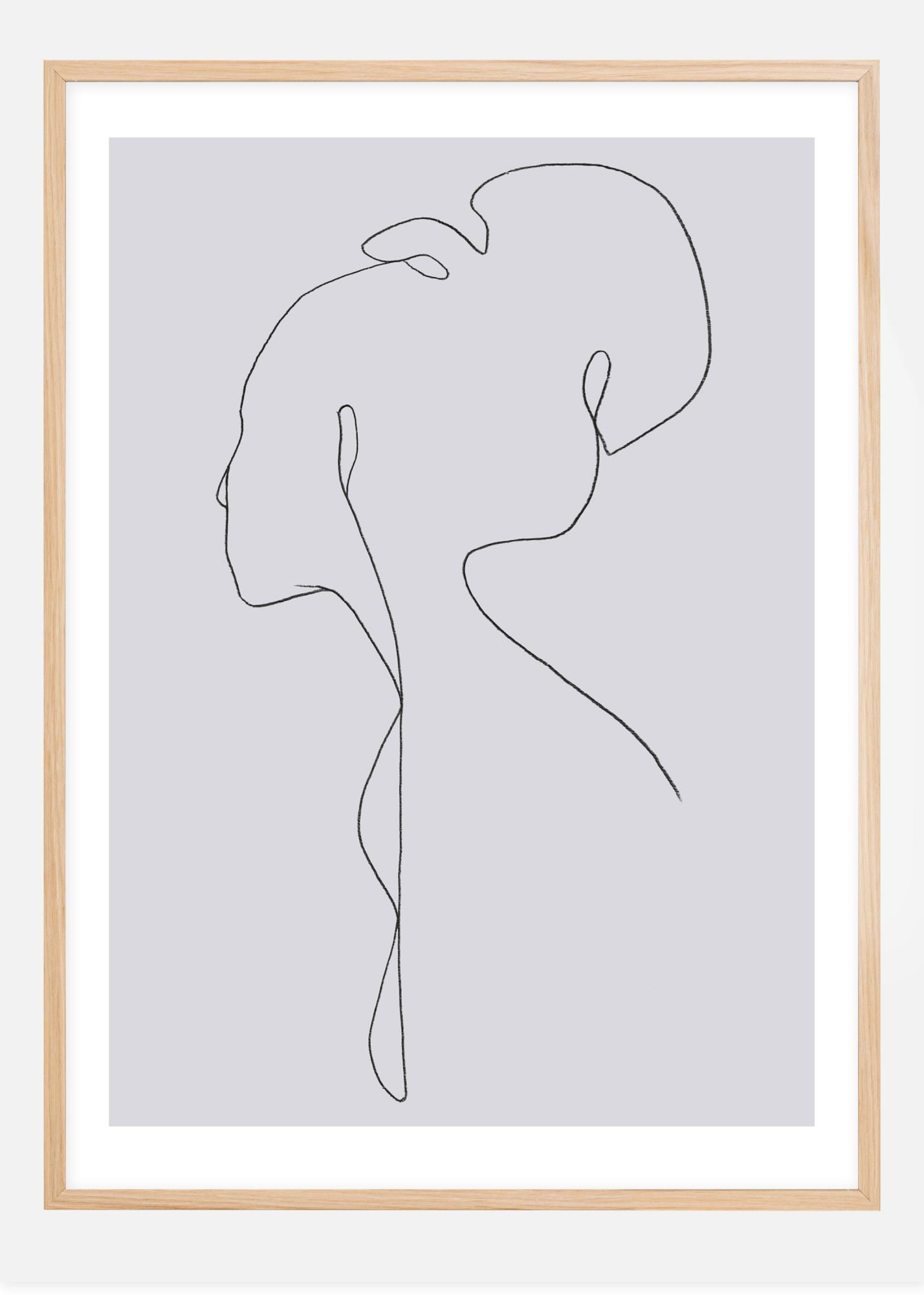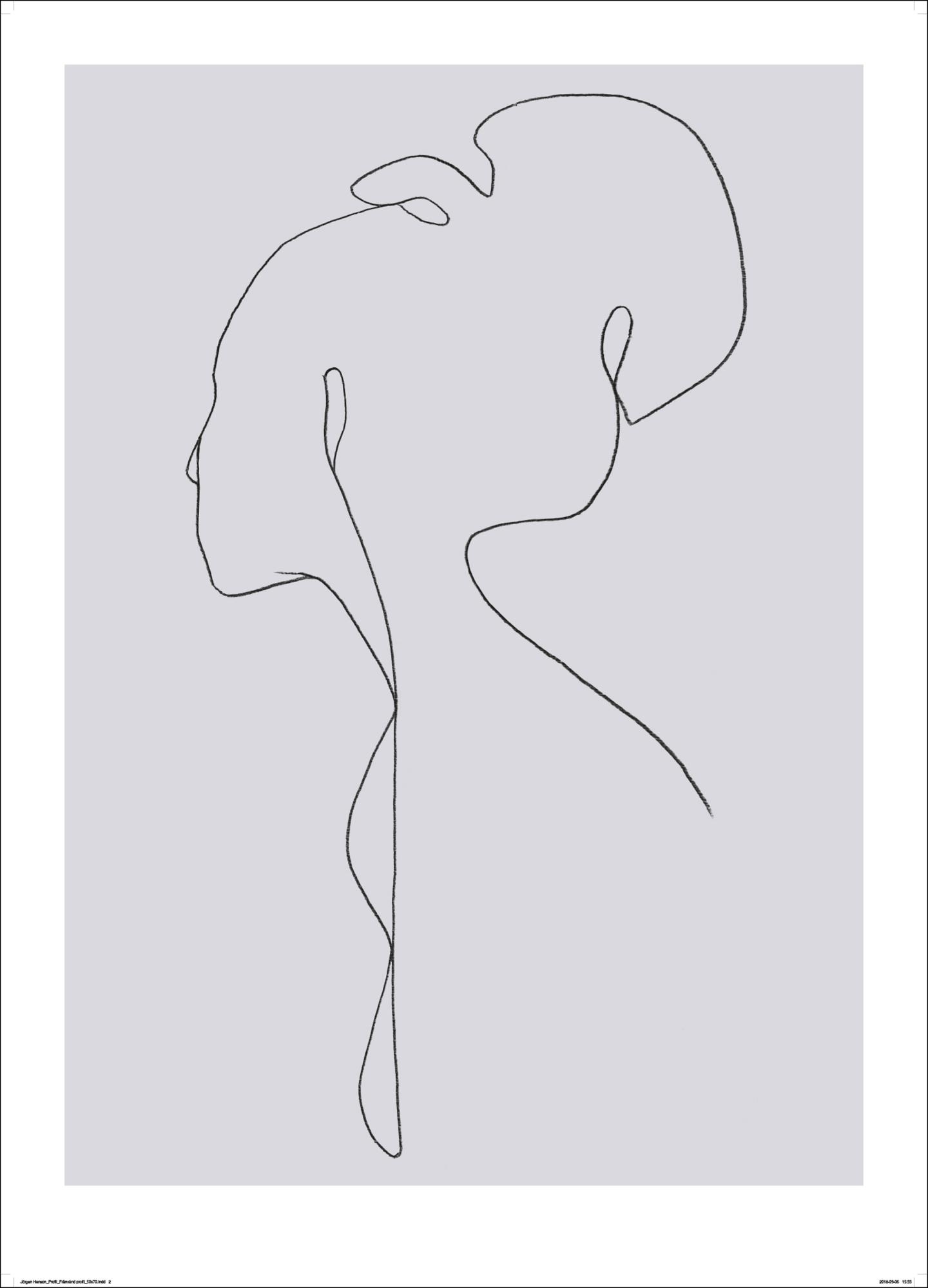 Avec des lignes noires fragiles sur un fond gris, le profil d'une femme prend forme. Son regard est détourné de l'observateur et ses cheveux sont relevés en un chignon sur sa tête. Un poster beau et épuré créé par Jörgen Hansson Art.