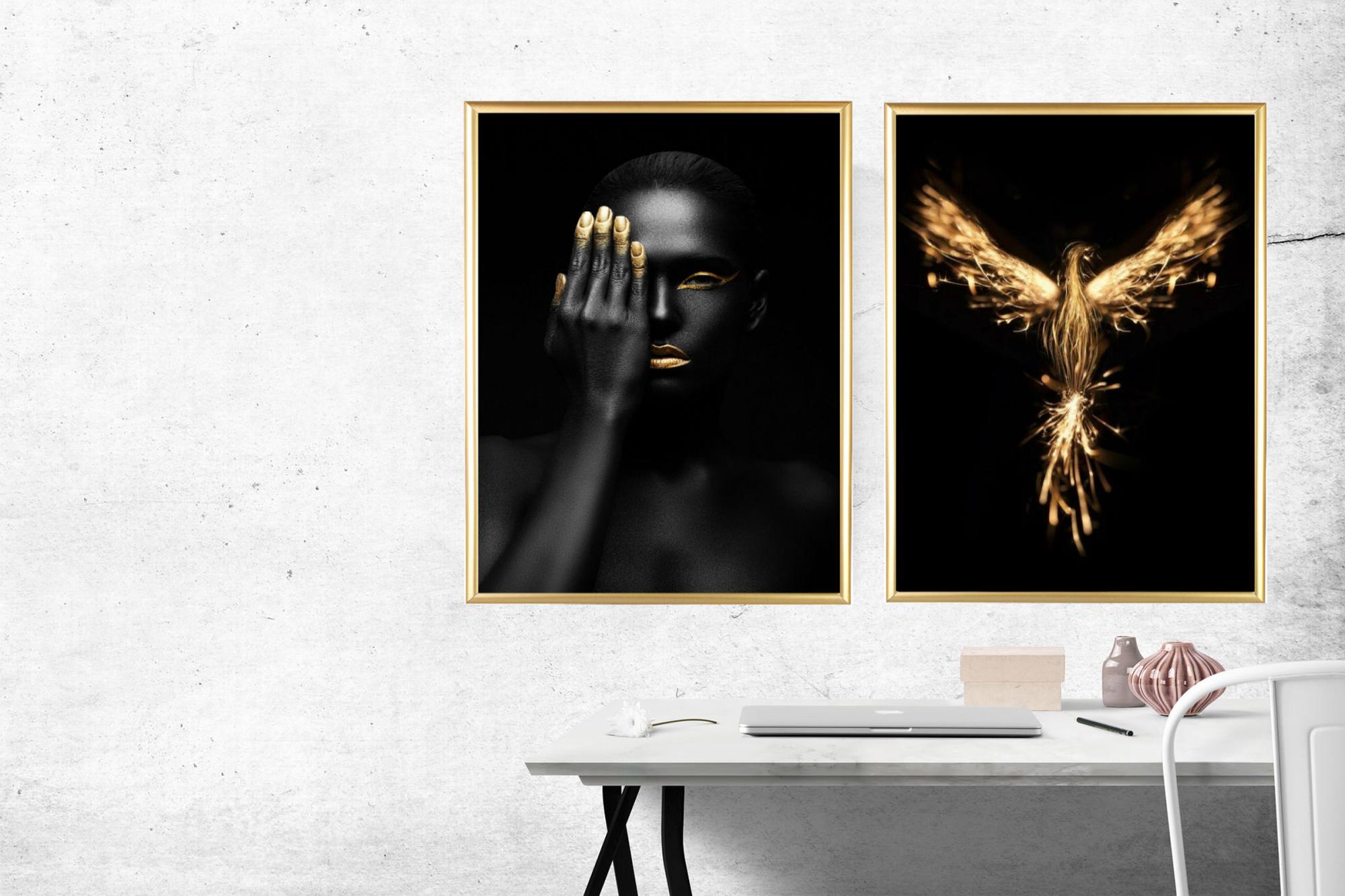 À travers l'art graphique, l'oiseau Phénix prend forme dans un feu d'artifice de tons dorés sur un fond noir. Un poster chaleureux et agréable dans un format minimaliste, parfait pour être associé avec d'autres favoris dans un grand collage.