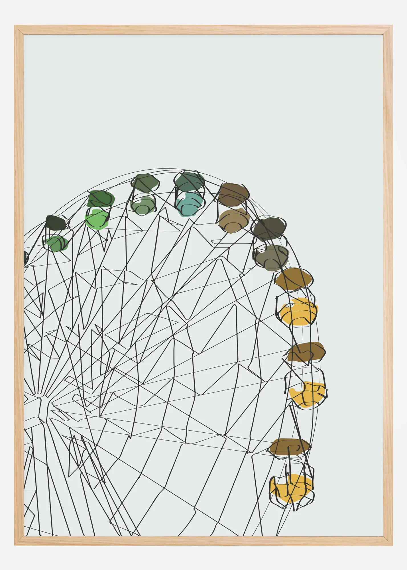 Art graphique linéaire d'une grande roue avec des paniers aux tons terreux sur un fond clair, créé par Linn Westanbäck. Un poster élégant qui transmet un merveilleux mélange de calme et d'aventure. N'hésitez pas à consulter notre gamme complète de Linn Westanbäck pour plus d'œuvres intéressantes.