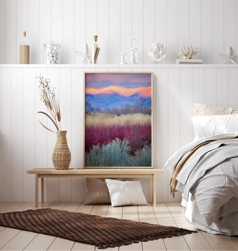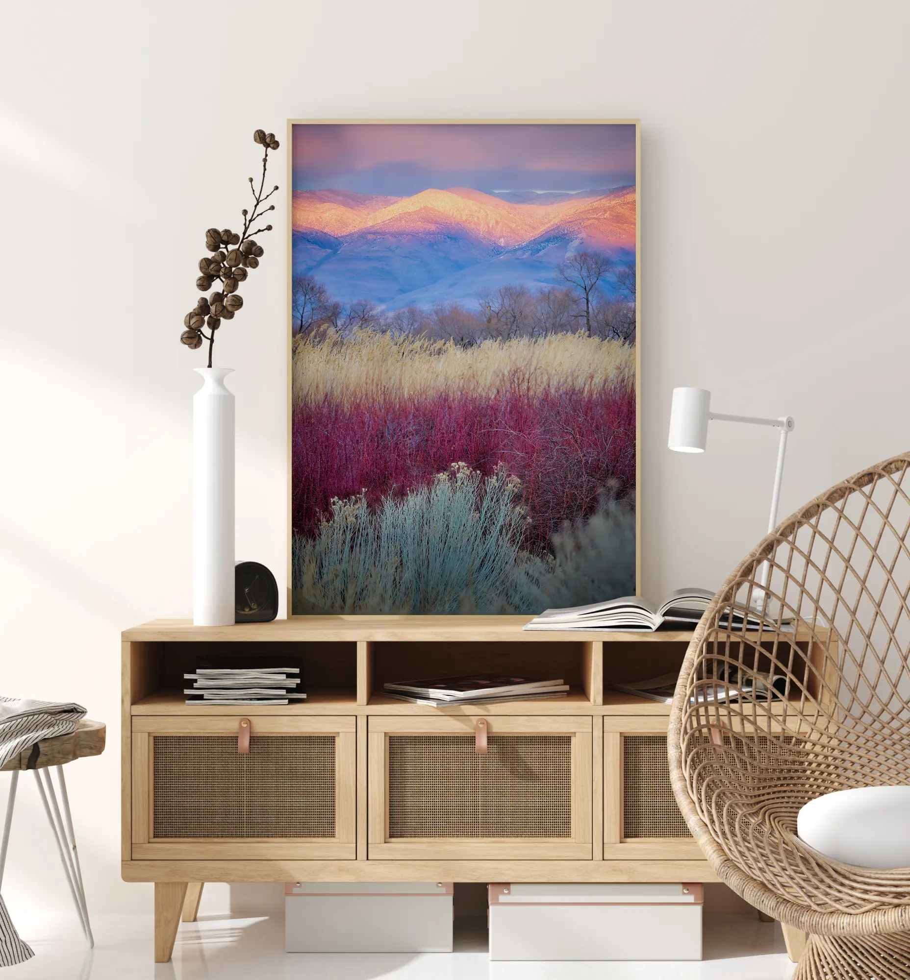 Une affiche colorée de champs en couches qui se dirigent vers des montagnes lointaines. Un éventail éblouissant de couleurs vives accueille l'œil, du vert au rose, en passant par le jaune, le bleu et l'orange. Le soleil commence à peine à percer les montagnes au loin. Ressentez la lumière du petit matin et la fraîcheur du jour dans cette œuvre.