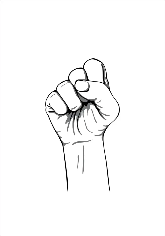 Une affiche représentant un poing serré au centre d'un fond blanc. Faites entendre votre voix, pensez fort, suivez vos convictions, tout cela et bien plus encore est criant dans ce dessin au trait simple, mais efficace, d'un poing fermé. Faites le point sur votre journée en voyant ce dessin sur votre mur.
