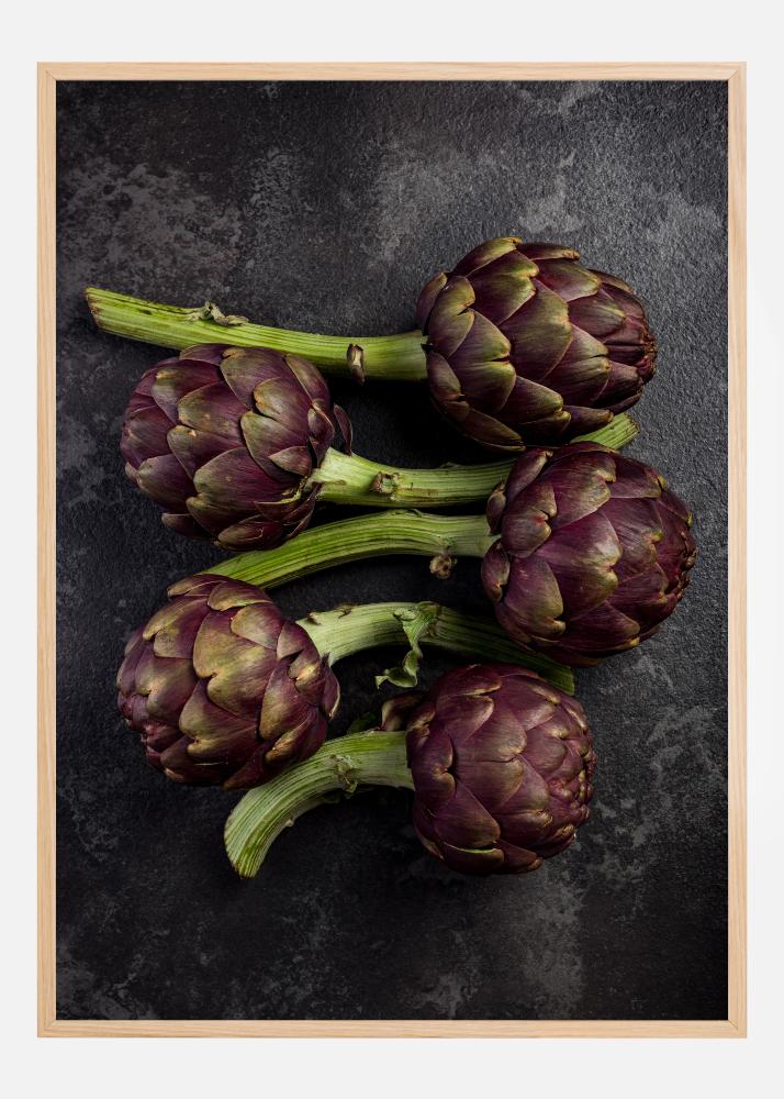 Cette affiche rustique et inspirée par la nature représente cinq artichauts richement nuancés sur un fond sombre et texturé. La photographie en gros plan met en valeur les nuances vertes profondes et rouge pourpre des feuilles des artichauts, et le motif terreux conviendrait bien dans une cuisine ou une salle à manger où il peut inspirer des aventures culinaires. Cette impression est non seulement un hommage à la beauté de la nature, mais aussi un rappel de la capacité des aliments frais à rassembler les gens.
