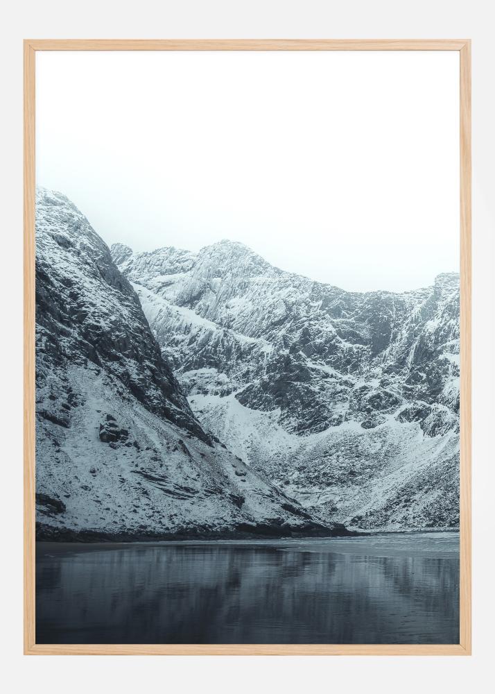 Une affiche spectaculaire de montagnes enneigées menant à une eau calme. Un lac lisse ou peut-être un fjord s'étend avec les montagnes enneigées qui le rencontrent en face. Un ciel d'un blanc éclatant contribue à créer une ambiance hivernale. Faites entrer la saison froide à l'intérieur en accrochant cette œuvre chez vous.