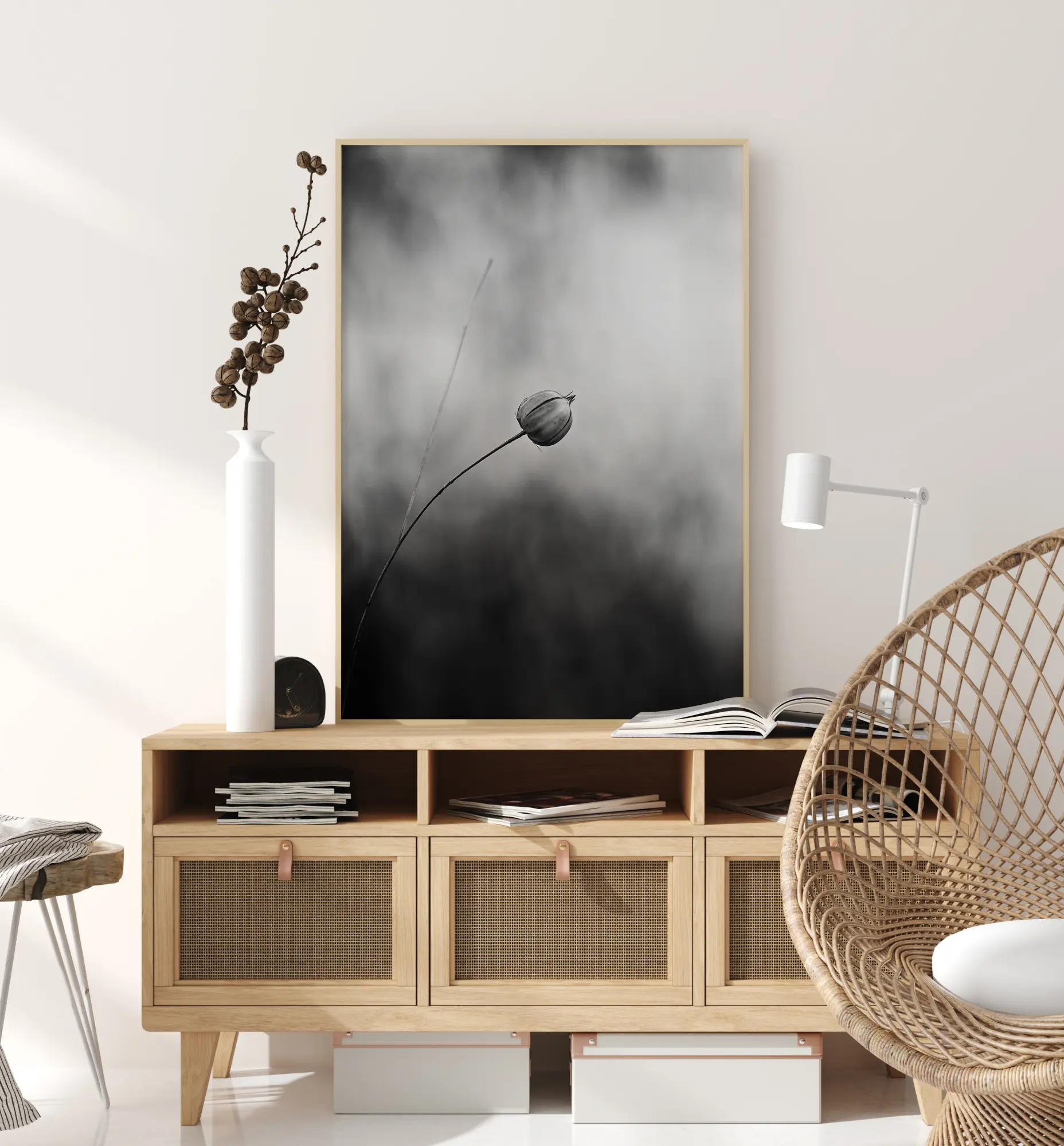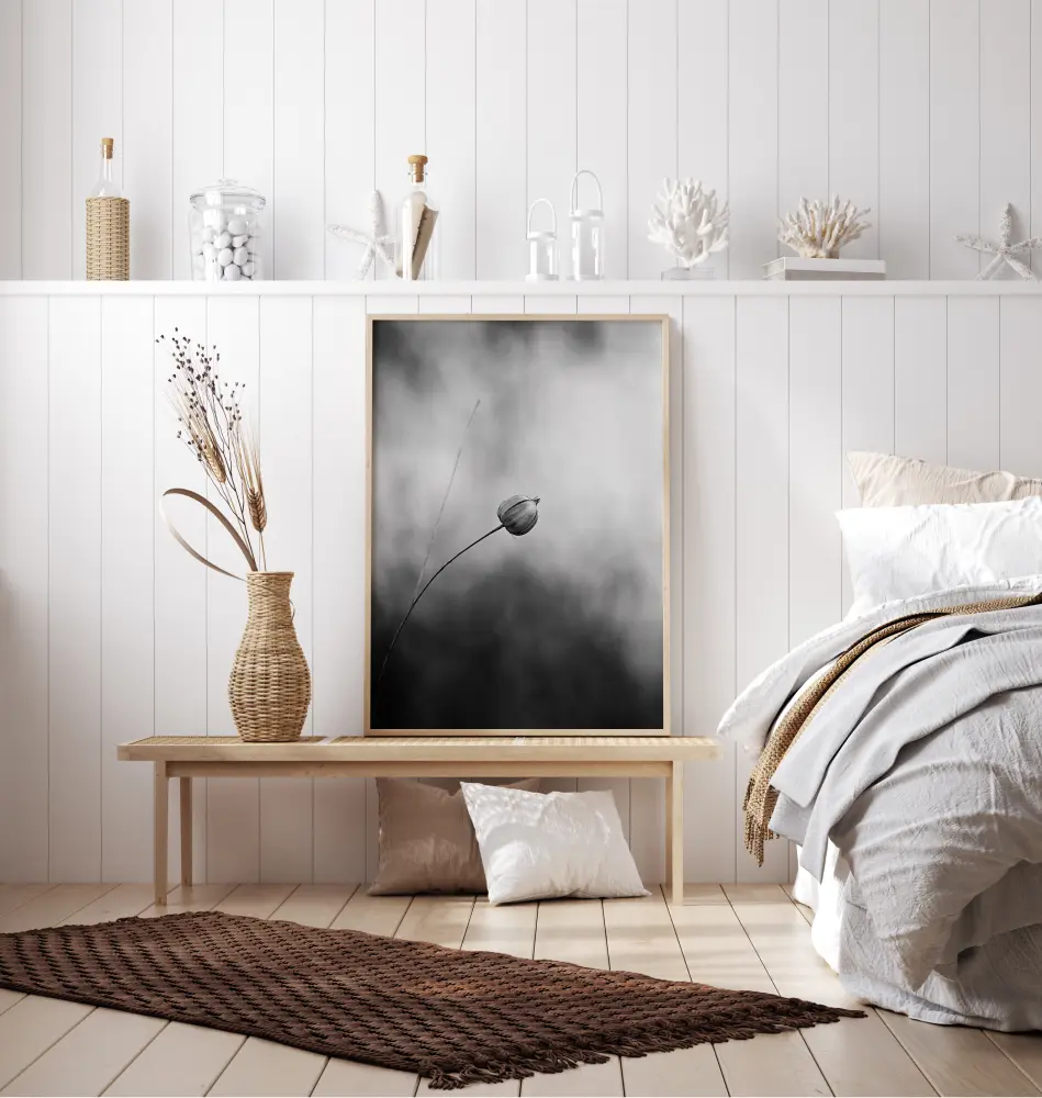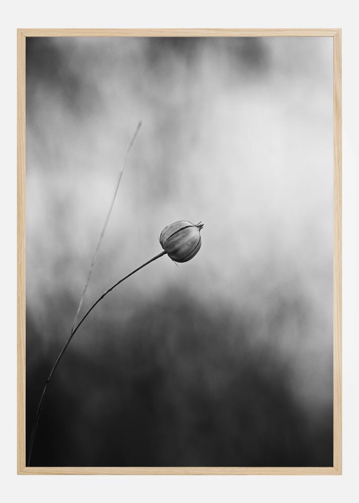 Une affiche en noir et blanc d'un brin de lin après sa floraison. Le lin se courbe au centre de l'image, mis en valeur par la lumière blanche. En dessous, l'arrière-plan est sombre et flou afin de maintenir l'attention sur la fleur. Apportez de la couleur à cette œuvre en choisissant un mur de couleur.