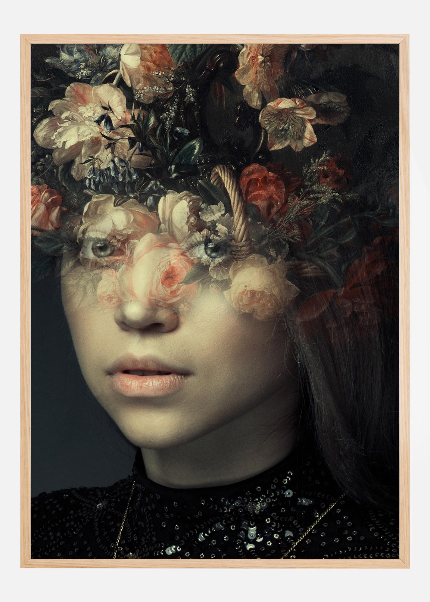 Cette affiche enchanteresse allie la beauté du portrait humain à l'esthétique immaculée de la nature. L'œuvre représente une femme dont le visage est partiellement caché par une riche composition florale, donnant un effet mystérieux et presque onirique. Cette œuvre d'art, avec sa couronne florissante et sa palette de couleurs douces et naturalistes, dégage une élégance intemporelle et une finesse artistique.
