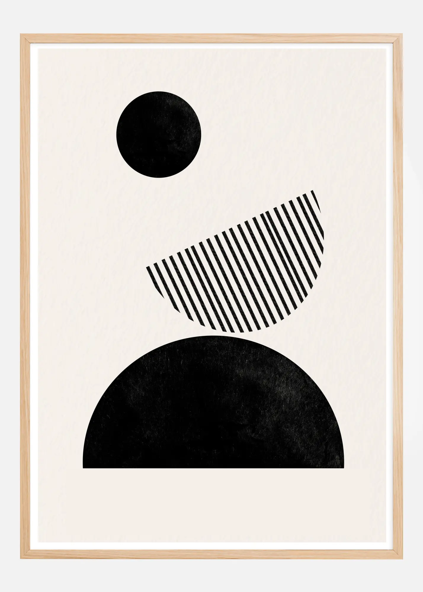 Cet affiche artistique se caractérise par son utilisation ludique des formes géométriques et des textures pour créer une composition équilibrée et moderne. Un grand cercle noir se trouve en haut, suivi d'une demi-cercle à rayures diagonales et d'une demi-forme circulaire noire solide à la base. Chaque élément contribue à une sensation de mouvement et de dynamisme, tandis que les couleurs uniformes créent une impression de cohérence et de simplicité.