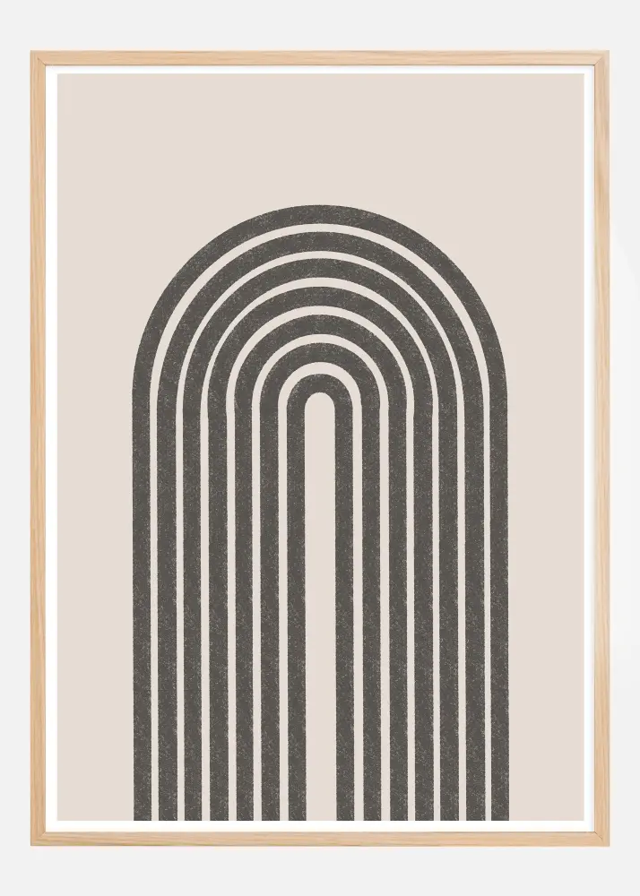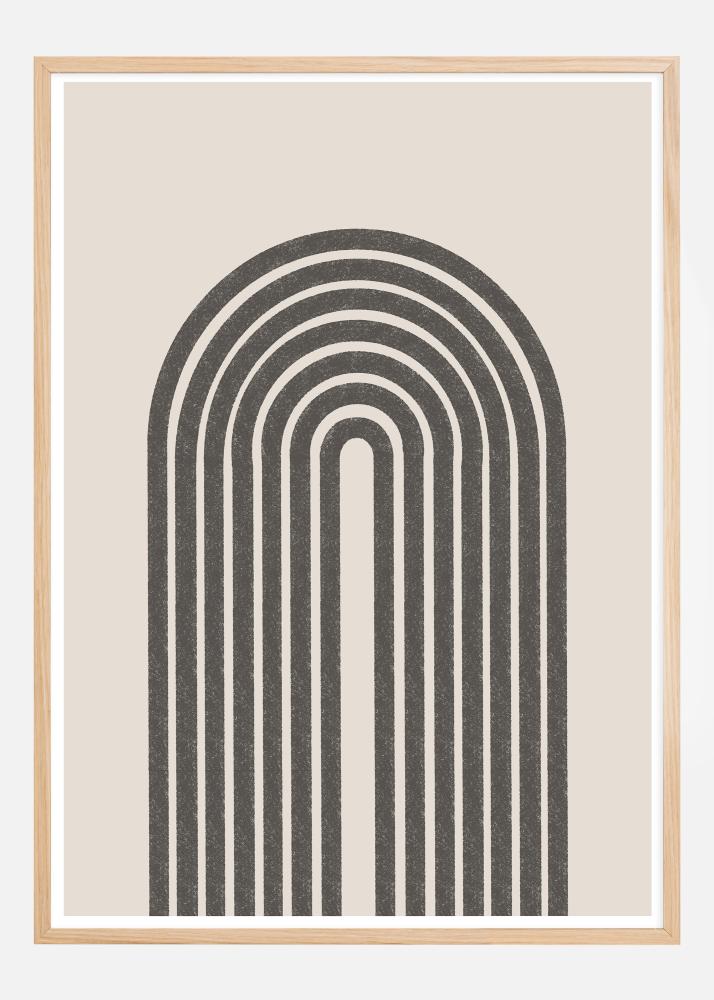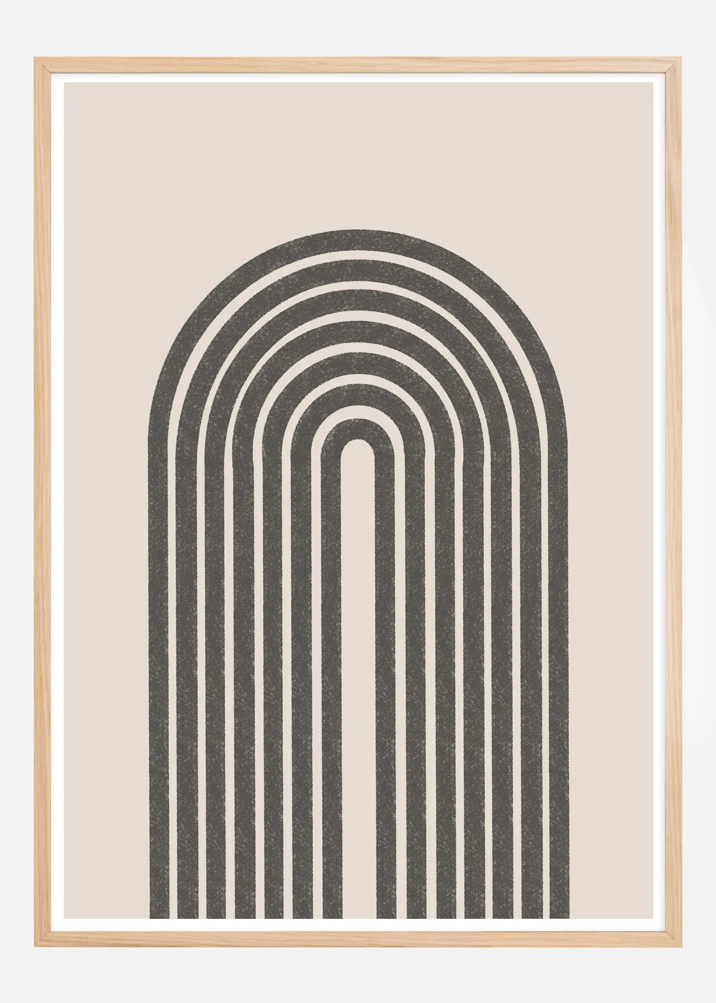Cette affiche minimaliste met en valeur une composition harmonieuse d'arcs concentriques dans une forme géométrique douce qui crée une sensation de calme et d'équilibre. Les lignes répétées dans une teinte sombre sur un fond neutre forment un design sophistiqué et contemporain, parfait pour l'amateur de décoration moderne. Les couleurs sont une combinaison riche en nuances de noir et de blanc cassé, ce qui rend cette impression facile à assortir avec différents styles de décoration et schémas de couleurs.